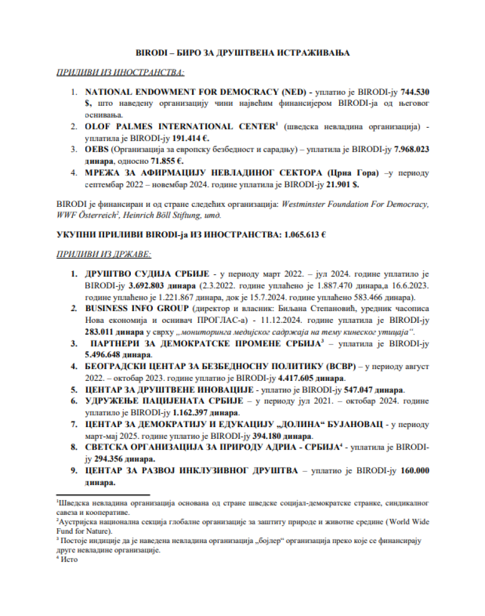 Švedska nevladina organizacija Olof palmes internešnl uplatila je na BIRODI 191.414 evra, dok je Organizacija za evropsku bezbednost i saradnju (OEBS) - uplatila je BIRODI 71.855 evra.