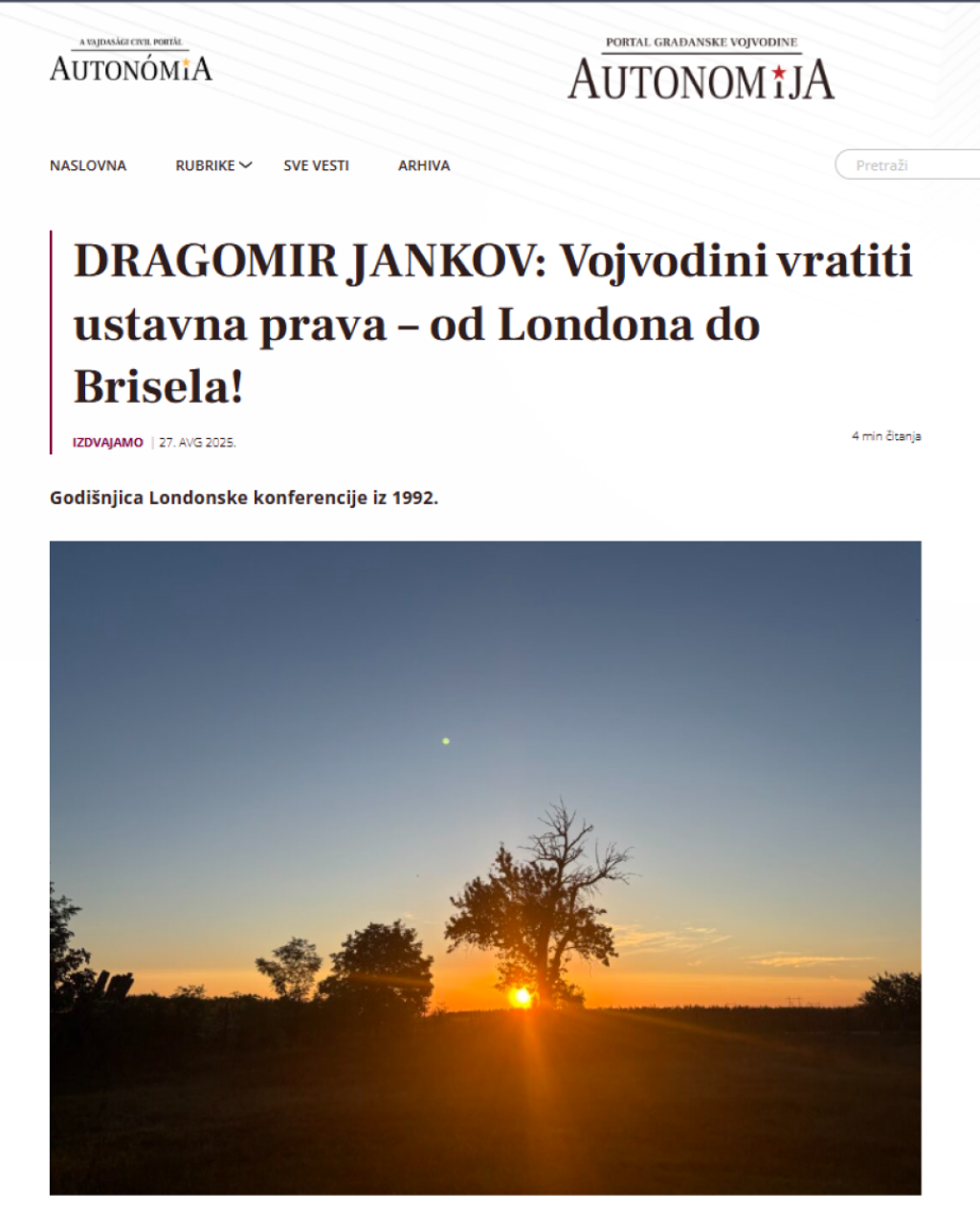 Na Gruhonjićevom portalu Autonomija objavljen je članak u kom se traži da se Vojvodini vrate ustavna prava, da Vojvodina mora biti međunarodno priznata, da pitanje Vojvodine više ne može biti isključivo unutrašnje i nedodirljivo pitanje Srbije!