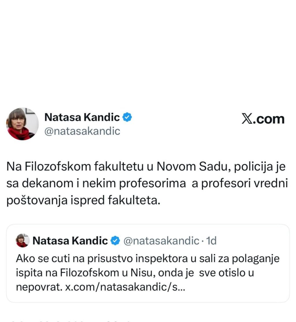 "Na Filozofskom fakultetu u Novom Sadu, policija je sa dekanom i nekim profesorima a profesori vredni poštovanja ispred fakulteta", napisala je Nataša Kandić.
