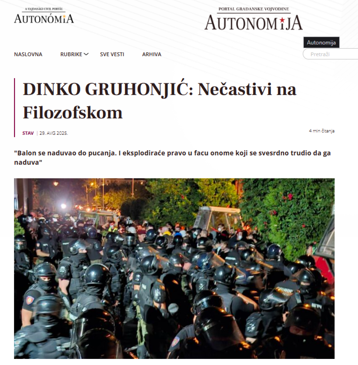 - Slike iz Novog Sada, gdje građani kreče fasade svojih zgrada koje je režim okrečio u srpske trobojke, takođe su emancipatorska poruka: zna se gdje je mjesto zastavama, ovo su naše fasade, nećete nas više prevariti „patriotizmom“ i „ekskluzivnim srpstvom“. Jer to što vi propovijedate jeste samo dimna zavjesa iza koje se kriju ratni zločini i ratni profit. To što vi emitujete preko svojih medija nije ništa drugo nego karneval gluposti, primitivizma, kiča i mržnje. I mi na to više ne pristajemo - piše između ostalog u skandaloznom tekstu.