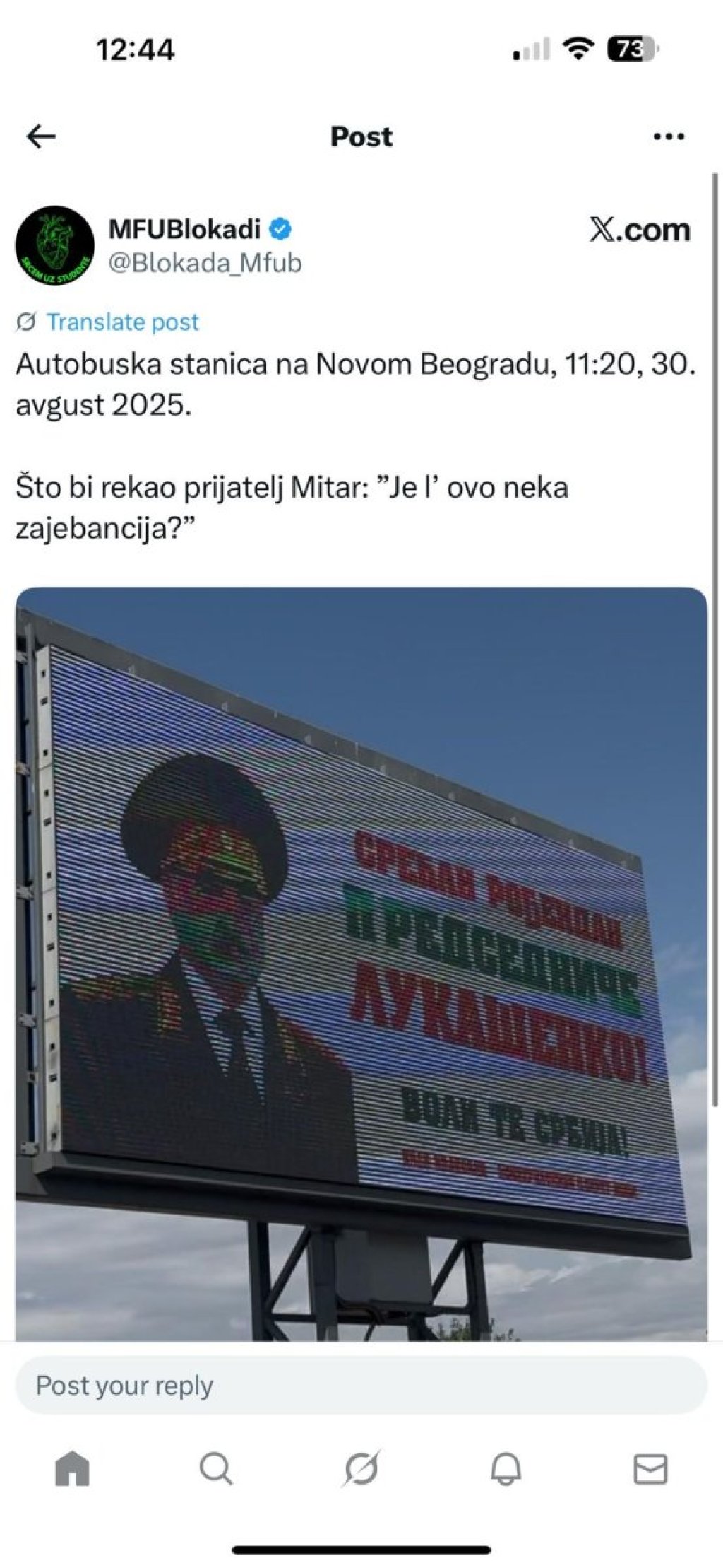 - Autobuska stanica na Novom Beogradu, 11.20, 30. avgust 2025. godine. Što bi rekao prijatelj Mitar, da li ovo neka zaje*ancija?! - objavljeno je na profilu IMFUBlokadi na mreži Iks, sa sve fotografijom bilborda očigleno načinjenom iz nekog autobusa.