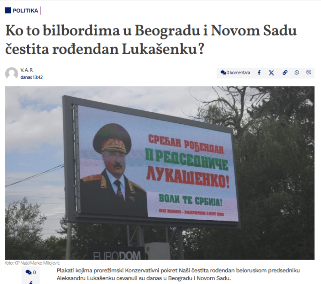 Inače, ovakvi bilbordi su dansas osvanuli i u Novom Sadu, a na sajtu KP Naši se navodi da je čestitka izraz prijateljstva i podrške srpskog naroda bratskoj Belorusiji i njenom predsedniku.