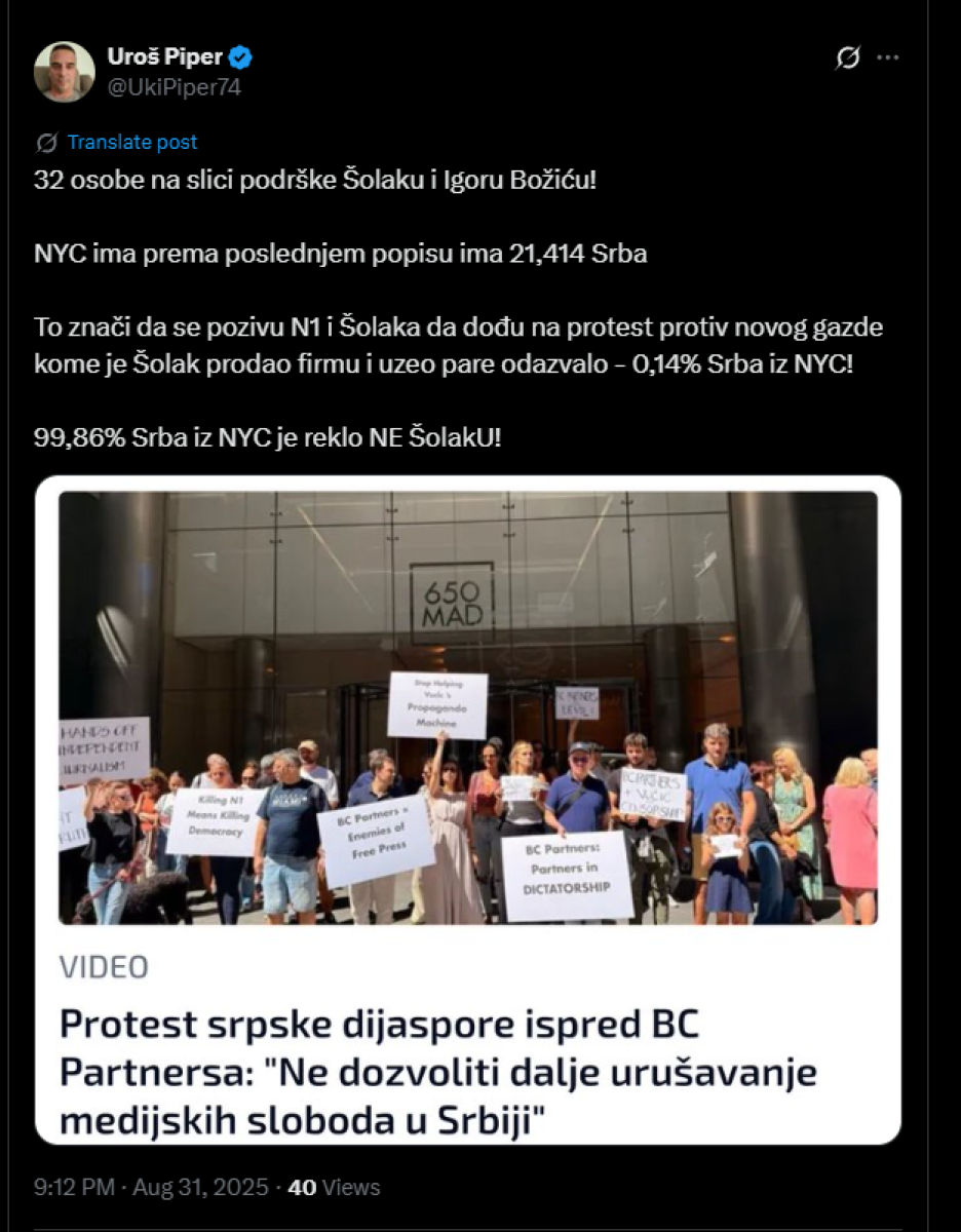 - 32 osobe na slici podrške Šolaku i Igoru Božiću! Njujork ima prema poslednjem popisu 21.414 Srba. To znači da se pozivu N1 i Šolaka da dođu na protest protiv novog gazde kome je Šolak prodao firmu i uzeo pare odazvalo - 0,14% Srba iz Njujorka. 99,86 odsto Srba iz Njujorka je reklo NE Šolaku! - napisao je Piper.