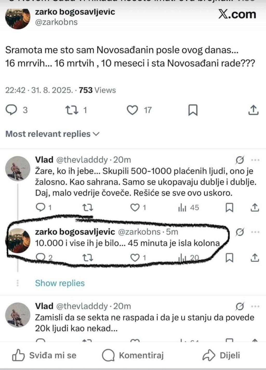 Pogledajte ove reakcije, ali i priznanje, takođe s očajem, da se u srpskoj Atini okupilo najmanje 10.000 Novosađana.