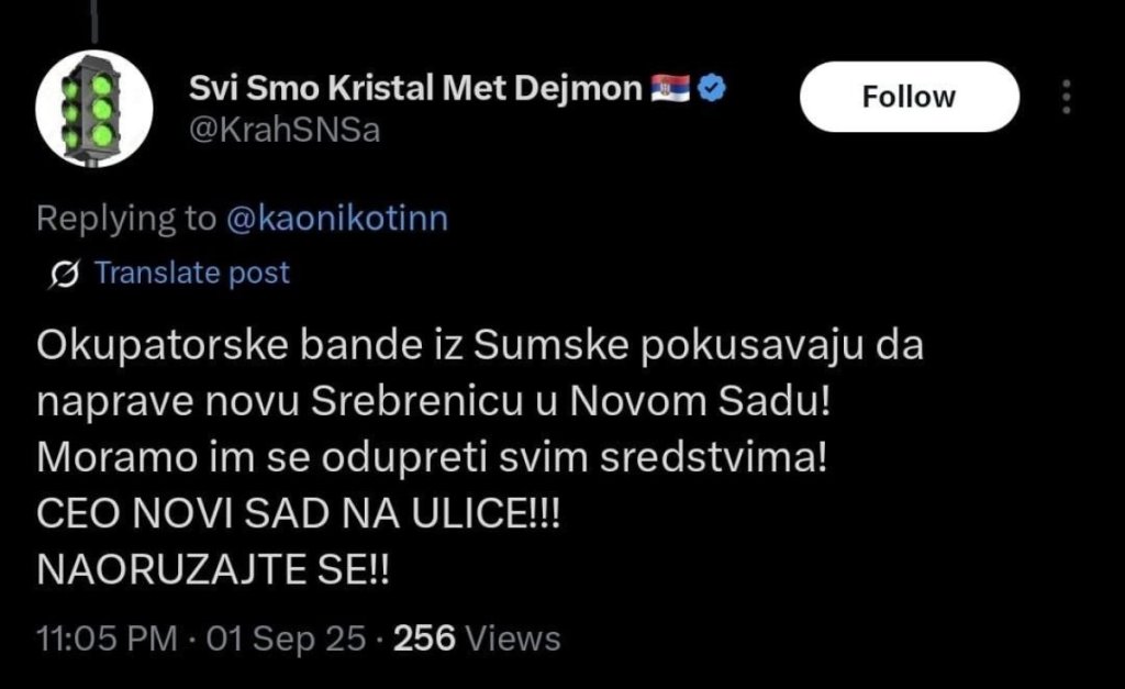 - Okupatorske bande iz Šumske pokušavaju da naprave novu Srebrenicu u Novom Sadu. Moramo im se odupreti svim sredstvima. Ceo Novi sad na ulice! Naoružajte se - napisao je ovaj fašista sinoć oko 23 sata na Iksu, očigledno rastrojen zbog činjenice da je dugonajavljivani blokaderski skup u čitavoj Srbiji juče doživeo neviđeni debakl.