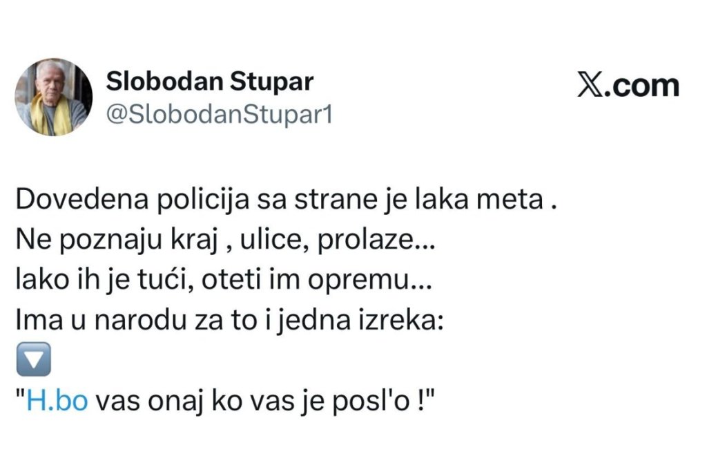 Samo nekoliko sati nakon što je ideolog blokadera i osvedočeni nasilnik Slobodan Stupar putem društvene mreže Iks poslao javni poziv svojim sledbenicima da otpočnu napade na policiju, osvanula je njegova nova skandalozna objava.