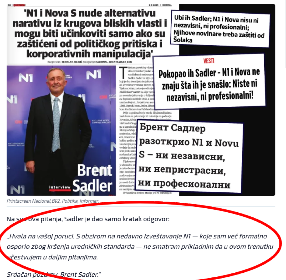 Nakon što je za hrvatski Nacional Sadler izjavio da je prethodno rukovodstvo "Junajted medije", firme pod čijim okriljem posluju tajkunske televizije i portali, donosilo političke odluke, usledila su pitanja koja je N1 poslao Sadler, ali i brutalan odgovor.