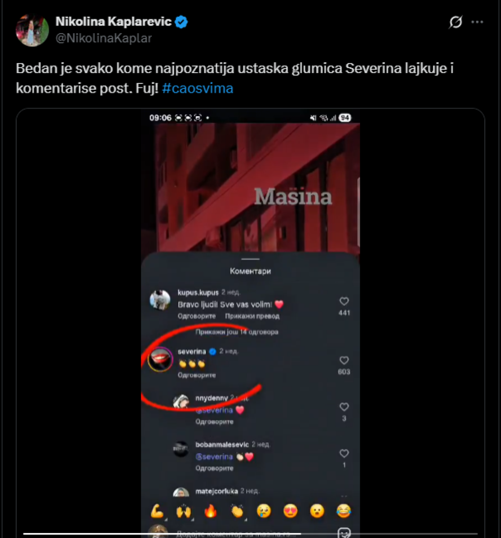 - Bedan je svako ko najpoznatiju ustašku glumicu vidi kako lajkuje i komentariše ovakve postove. Fuj! - glasi jedan od brojnih komentara.
