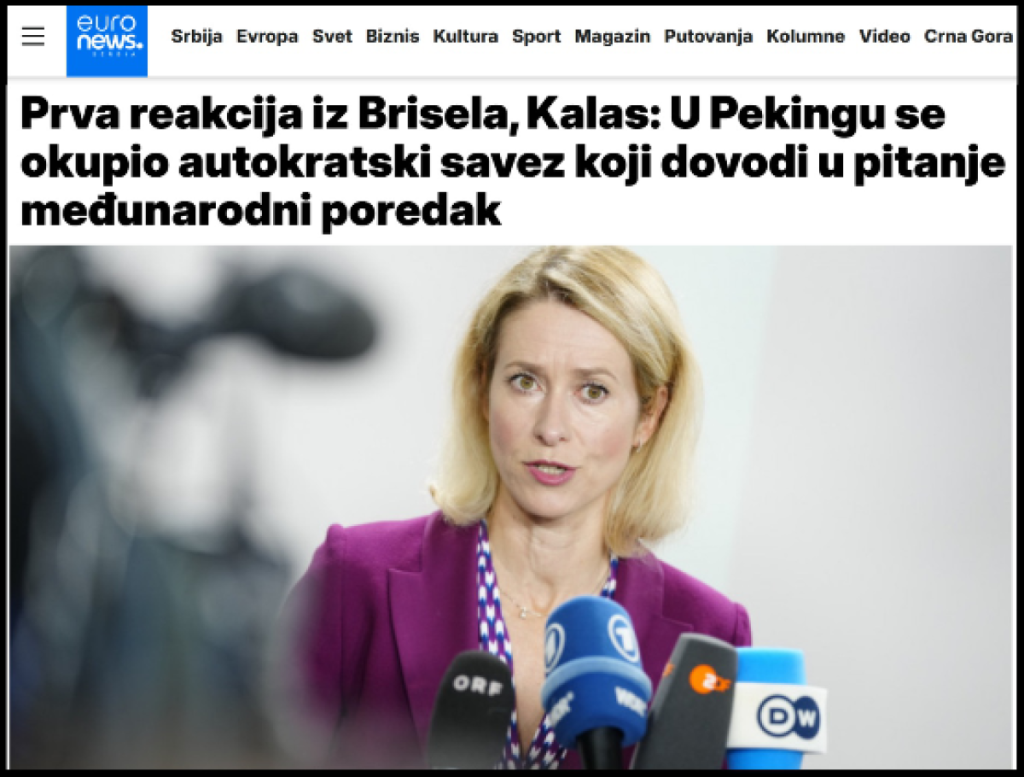 Pre će biti da je NATO autokratski savez. NATO čiji je generalni sekretar trebala da postane gđa Kalas. Gđa Kalas vidi trun u oku 29 šefova država koji su prisustvovali Samitu ŠOS i proslavi kineskog Dana pobede, a ne vidi balvan u svom oku, i u oku NATO. NATO je relikt hladnog rata, autokratski savez nastao kao odgovor na postojanje Istočnog bloka i SSSR-a. Raspadom Istočnog bloka i SSSR-a, potreba za postojanjem NATO je prestala. Autokratski savez – NATO je 1999. godine, izveo bezrazložno zločinačko bombardovanje suverene države SR Jugoslavije bez bilo kakve odluke UN, kršenjem Povelje UN i protivno međunarodnom pravu. Autokratski savez – NATO je 1999. godine, pobio oko 2000 ljudi, oko 6000 ranio i naneo materijalnu štetu SR Jugoslaviji od najmanje 50 milijardi dolara. Tom prilikom NATO zločinci su bombardovali ambasadu Kine u Beogradu, i ubili troje kineskih građana. Zločinački NATO je potom u junu 1999. vojno okupirao Kosovo i Metohiju, neotuđivi deo Srbije. To je autokratski i zločinački savez.