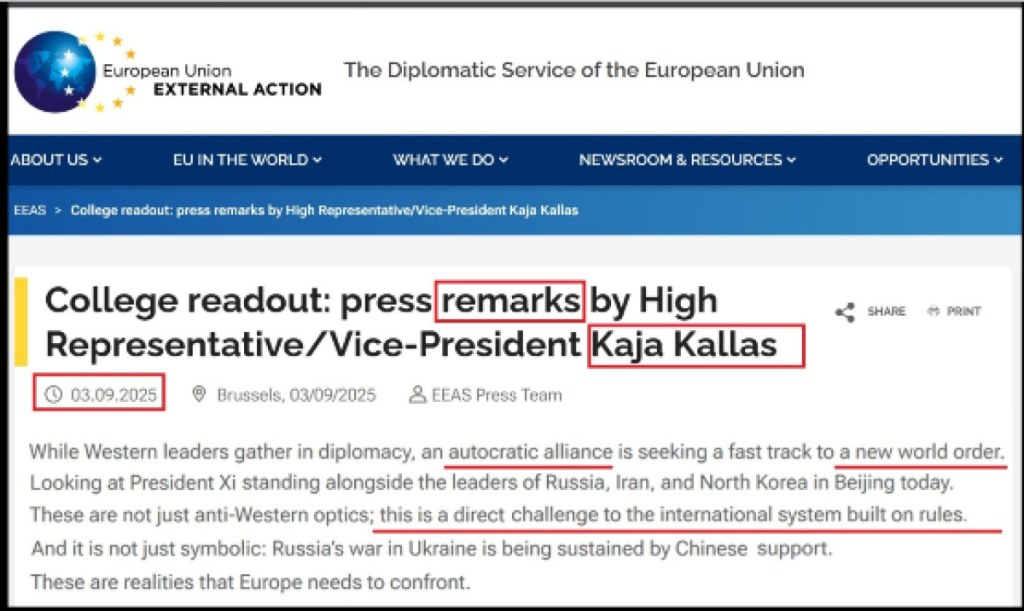 Visoka predstavnica Evropske unije za spoljnu politiku Kaja Kalas izjavila je 03.09.2025 da predsednici Kine, Rusije, Irana, Severne Koreje i drugih država, okupljeni u Pekingu, predstavljaju "autokratski savez" (autocratic alliance) koji dovodi u pitanje međunarodni poredak zasnovan na pravilima. Kaja Kalas je rekla: "Dok se zapadni lideri diplomatski okupljaju, autrokratski savez traži brz put ka novom svetskom poretku. Gledajući predsednika Sija kako stoji pored lidera Rusije, Irana i Severne Koreje, danas u Pekingu. Ovo nije samo antizapadna optika; to je direktan izazov međunarodnom sistemu zasnovanom na pravilima. I to nije samo simbolika: Ruski rat u Ukrajini je neprekidan zbog Kineske podrške. To su realnosti sa kojima Evropa mora da se suoči". ("While Western leaders gather in diplomacy, an autocratic alliance is seeking a fast track to a new world order. Looking at President Xi standing alongside the leaders of Russia, Iran, and North Korea in Beijing today. These are not just anti-Western optics; this is a direct challenge to the international system built on rules. And it is not just symbolic: Russia’s war in Ukraine is being sustained by Chinese support. These are realities that Europe needs to confront").