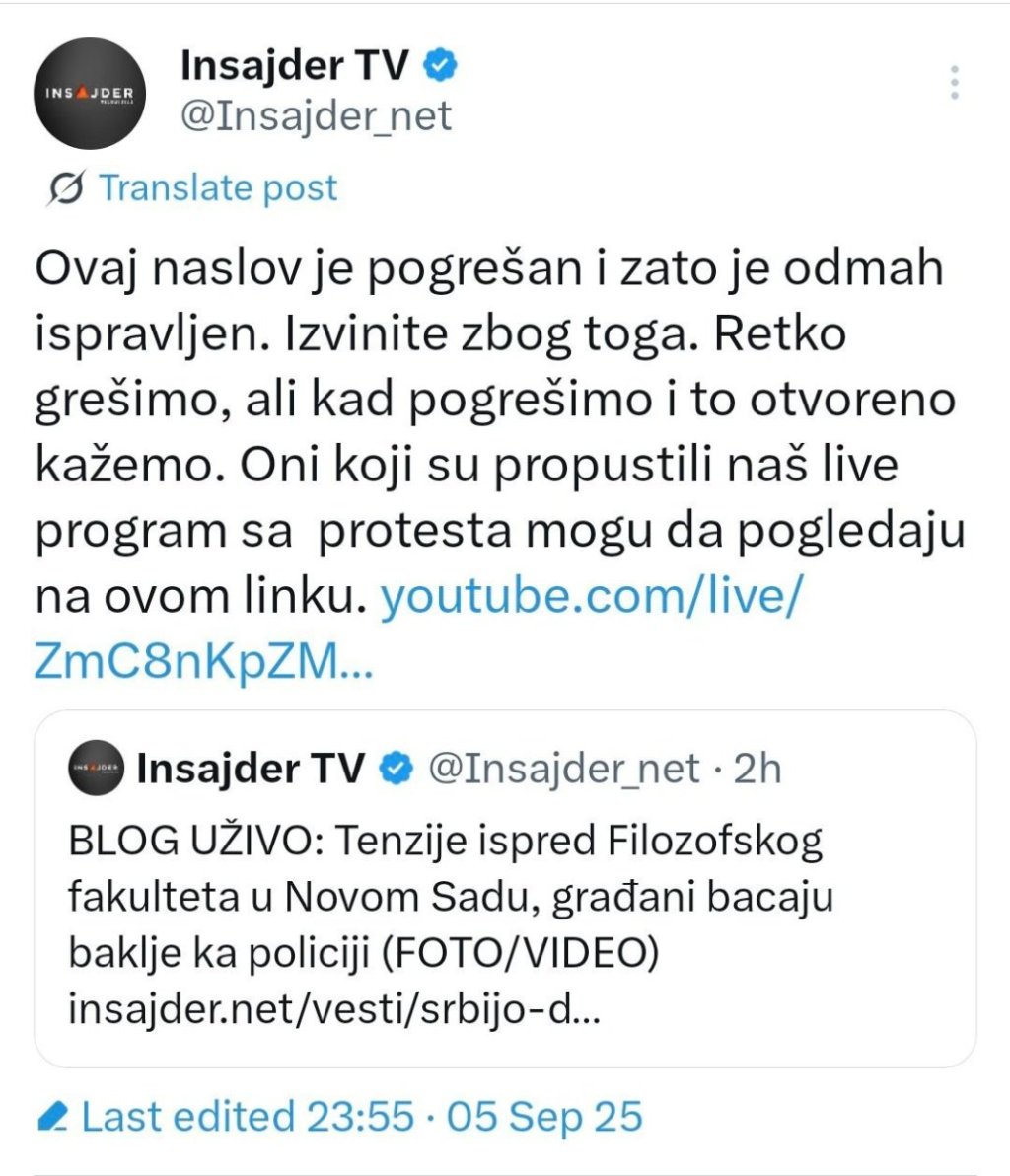 - Blokaderi teroristi su večeras prešli CRVENU LINIJU - kao Banderovci u Odesi (2014. godine) pokušali su da zapale Filozofski fakultet gde se nalazio dekan sa profesorima tog fakulteta! Pod hitno uvođenje antiterorističkih mera - napisao je Piper.