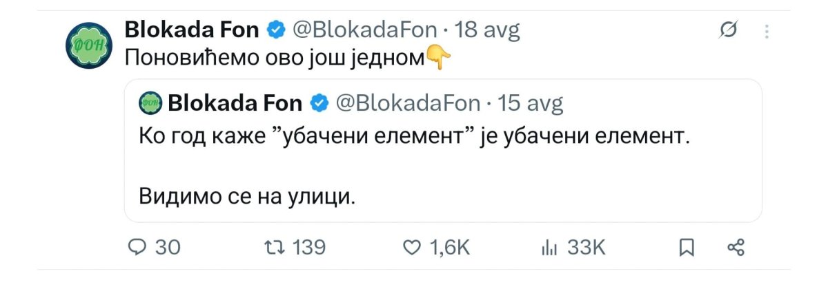 Jedan od najaktivnijih blokaderskih naloga na "Iksu" "Blokada Fon" 15. avgusta objavio je: