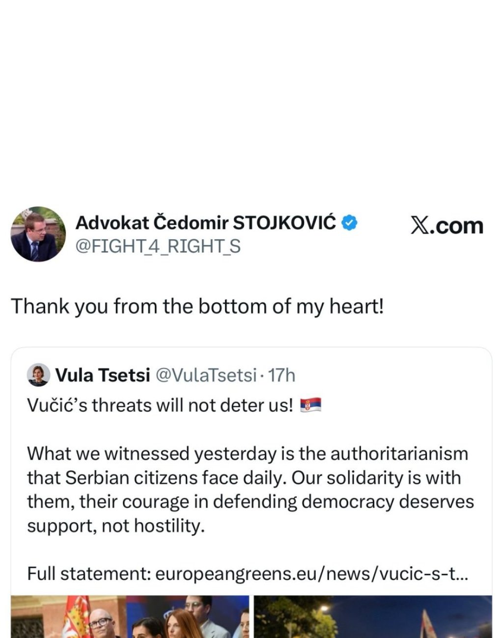 U kojoj meri je spreman da ide protiv interesa Srbije i volje većine naroda naše zemlje pokazuje njegov najnoviji komentar na društvenoj mreži Iks, kojim se, verovali ili ne, ulizuje Vuli Ceci. Reč je o članici Evropske zelene partije koja je došla u našu zemlju kako bi podržala njeno rušenje, što je pokazala i ličnim prisustvom preksinoć u Novom Sadu, gde se odvijalo nezapamćeno nasilje nad policijom u režiji blokadera.