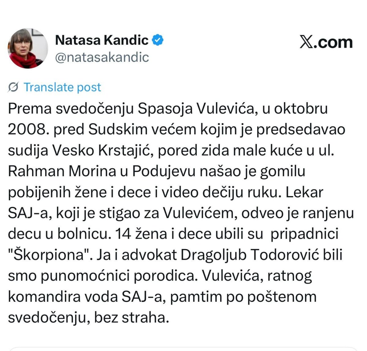 - Prema svedočenju Spasoja Vulevića, u oktobru 2008. pred Sudskim većem kojim je predsedavao sudija Vesko Krstajić, pored zida male kuće u ul. Rahman Morina u Podujevu našao je gomilu pobijenih žene i dece i video dečiju ruku. Lekar SAJ-a, koji je stigao za Vulevićem, odveo je ranjenu decu u bolnicu. 14 žena i dece ubili su pripadnici "Škorpiona". Ja i advokat Dragoljub Todorović bili smo punomoćnici porodica. Vulevića, ratnog komandira voda SAJ-a, pamtim po poštenom svedočenju, bez straha - navela je Kandićka na "Iksu".