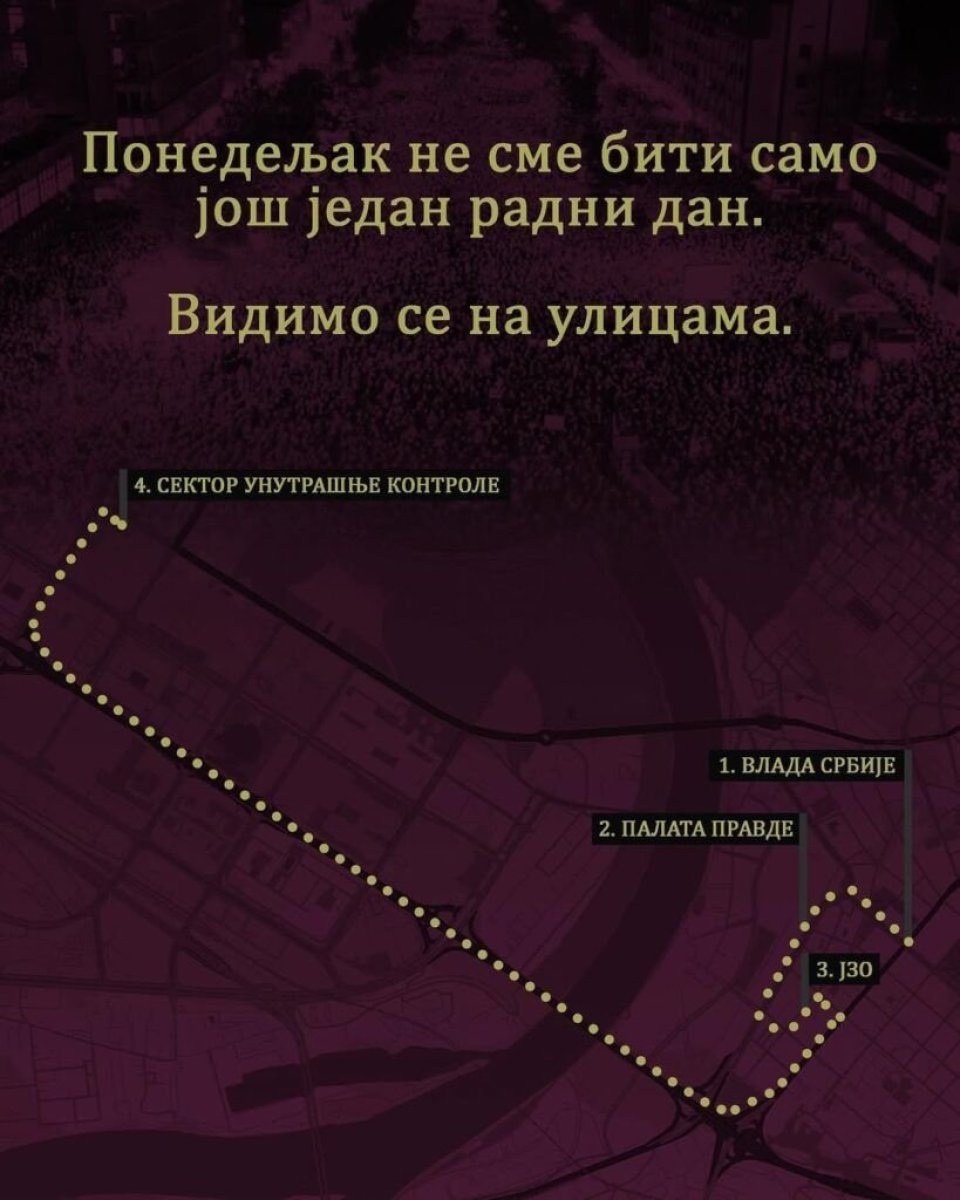 Kako se navodi, blokaderi će šetati do Palate pravde, zatim do zgrade Jedinice za obezbeđenje određenih ličnosti i objekata, kao i do Sektora unutrašnje kontrole Ministarstva unutrašnjih poslova.