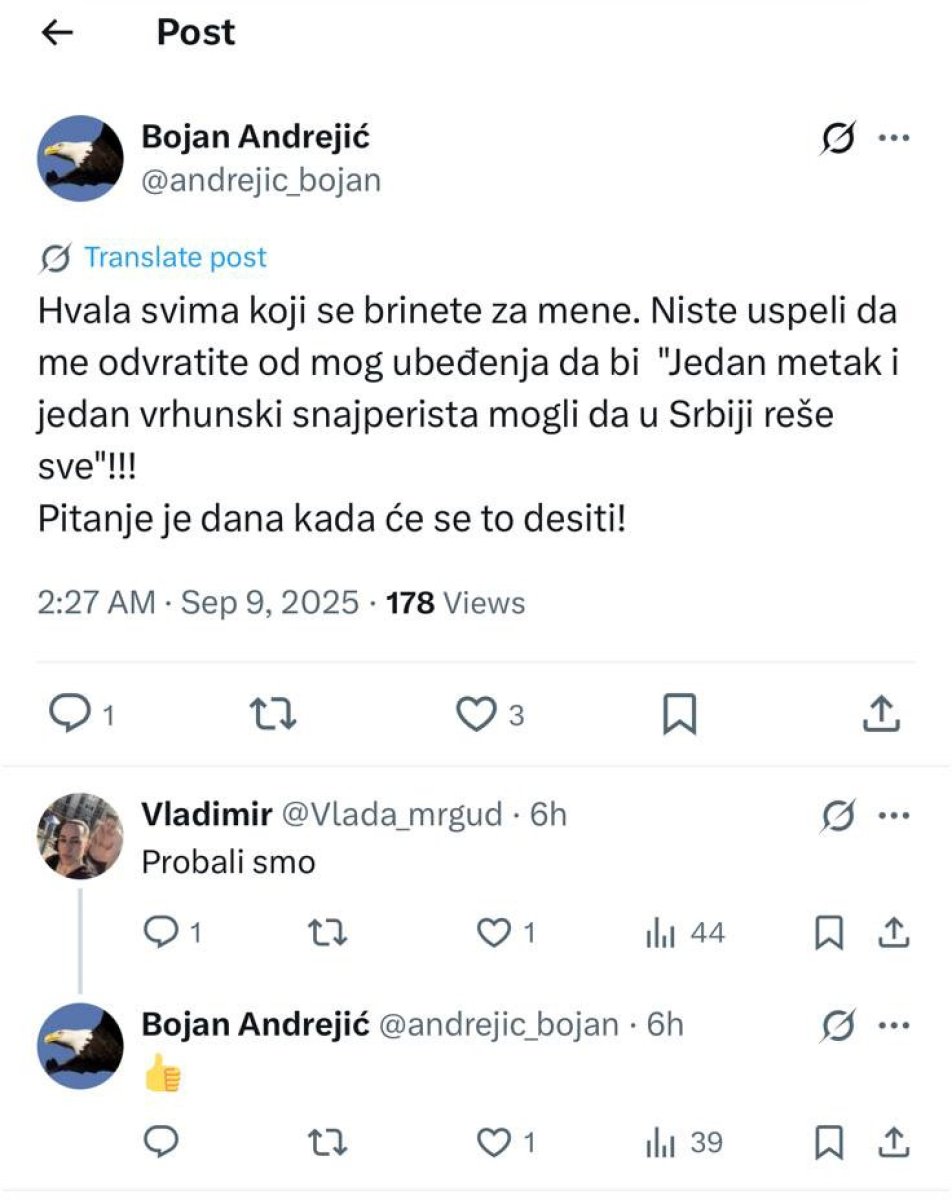 "Jedan metak i jedan vrhunski snajperista bi mogli da u Srbiji reše sve", napisao je Andrejić, koji je čak i na kritike svojih istomišljenika da je pretereo i da bi trebalo da obriše objavu, to odbio!?!