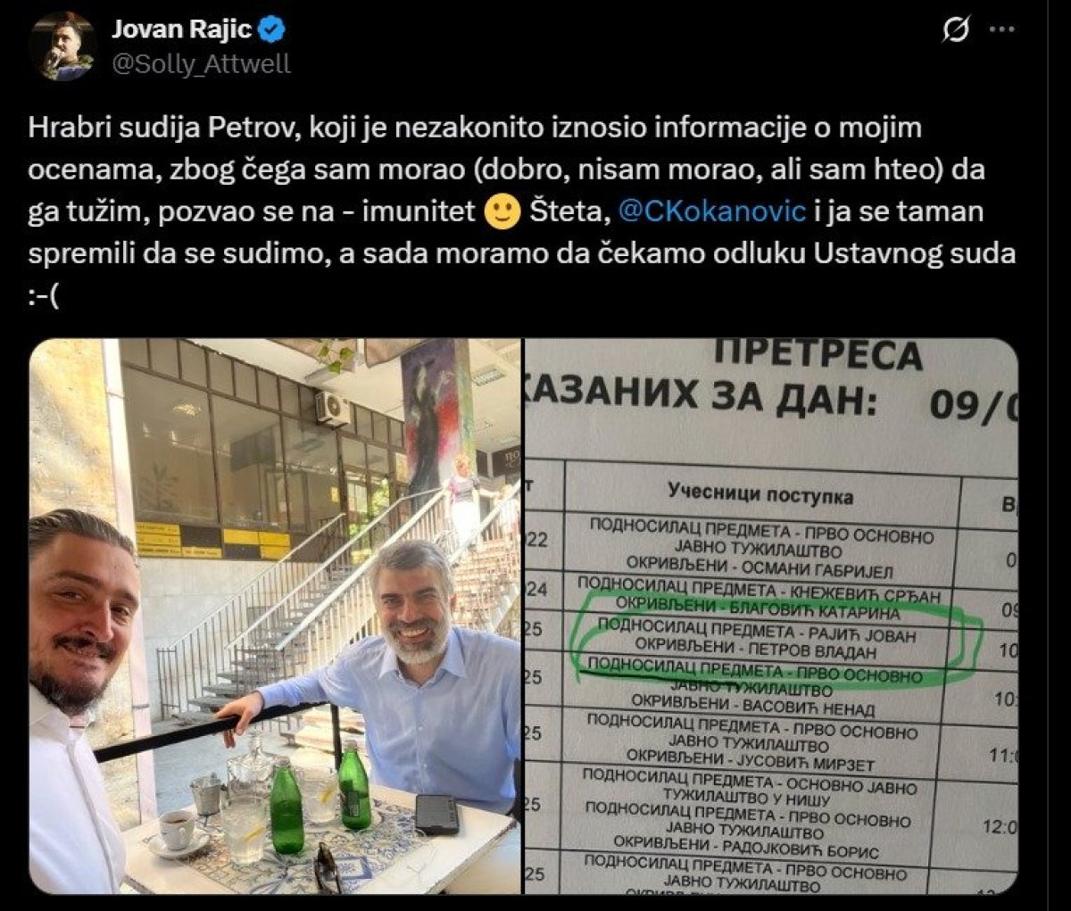 Pošto se advokat prethodno pohvalio podnetom krivičnom prijavom, on je danas obavestio javnost kako se „hrabri sudija Petrov pozvao na imunitet", te da će sada „morati da čekaju na odluku Ustavnog suda" pre nego li ga privedu k poznaniju prava.