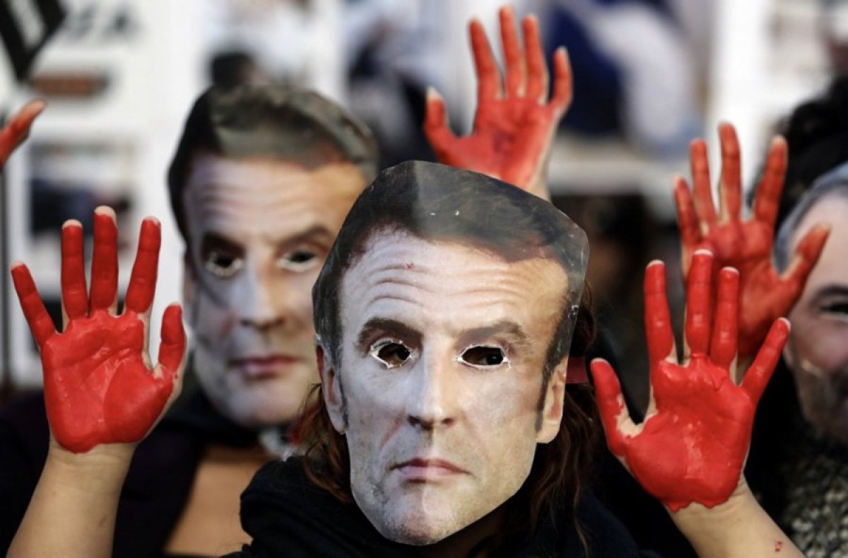 Tokom demonstracija u znak podrške palestinskom narodu, u Monpeljeu, Francuska, 11. novembra 2023. godine ljudi su nosili maske sa likom francuskog predsednika i pritom pokazivali svoje crveno obojene ruke.