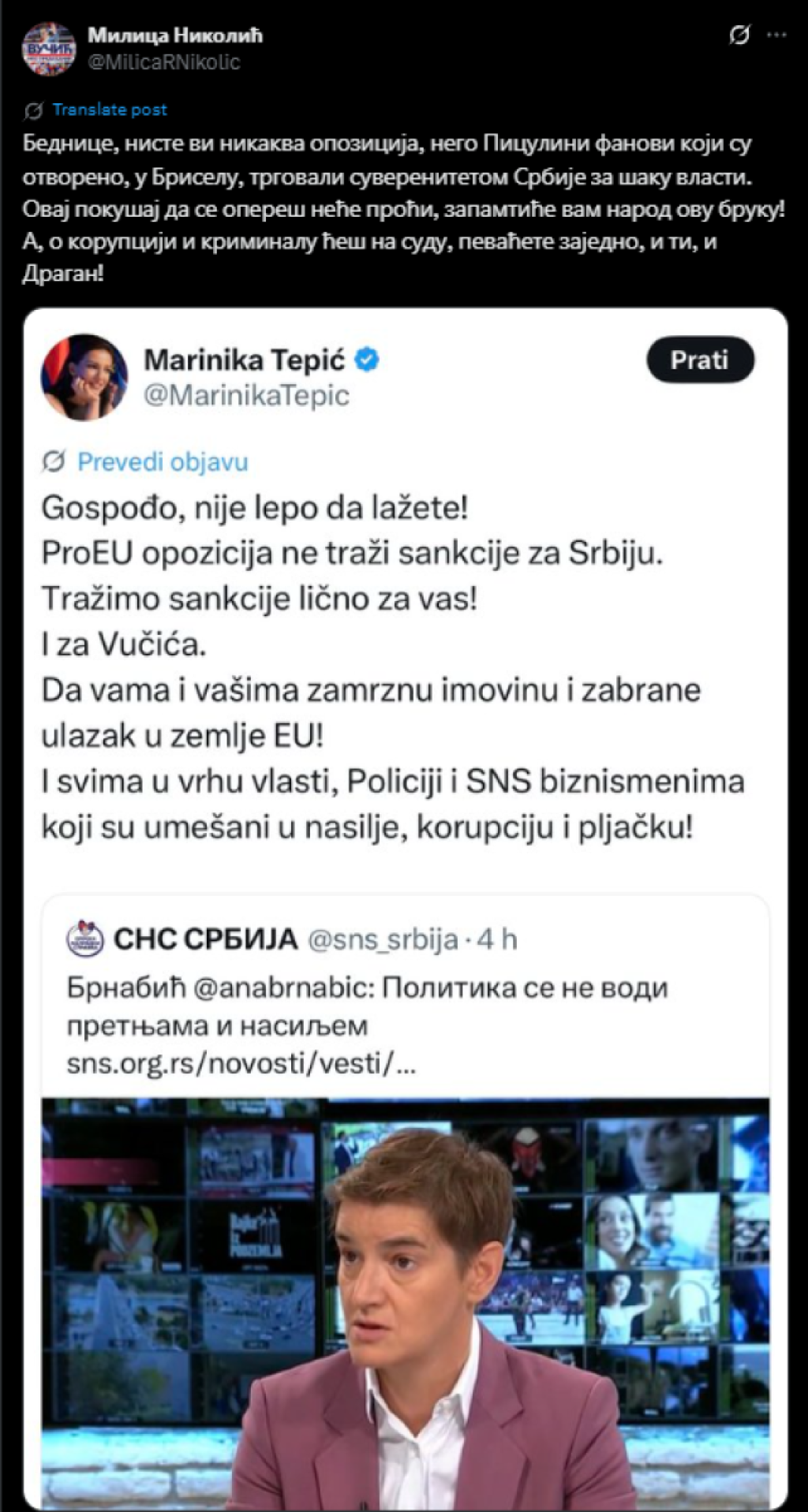 - Gospođo, nije lepo da lažete! ProEU opozicija ne traži sankcije za Srbiju. Tražimo sankcije lično za vas! I za Vučića. Da vama i vašima zamrznu imovinu i zabrane ulazak u zemlje EU! I svima u vrhu vlasti, Policiji i SNS biznismenima koji su umešani u nasilje, korupciju i pljačku - napisala je Tepićeva.