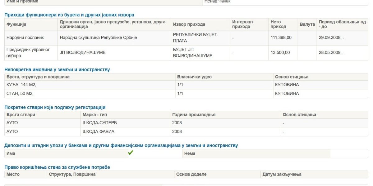 Nenad Čanak, kako se vidi iz njegove imovinske karte, ima čak četiri stana, dve kuće, džip "škoda kodijak", penziju od 155.000 dinara.