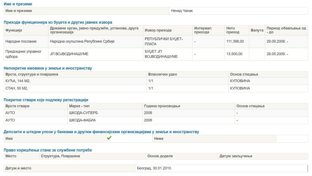 Ovo su najnoviji podaci o imovini koju je Nenad Čanak prijavio Agenciji za borbu protiv korupcije.