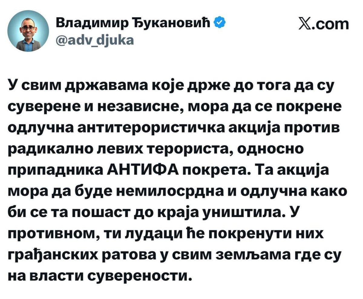 - U svim državama koje drže do toga da su suverene i nezavisne, mora da se pokrene odlučna antiteroristička akcija protiv radikalno levih terorista, odnosno pripadnika ANTIFA pokreta. Ta akcija mora da bude nemilosrdna i odlučna kako bi se ta pošast do kraja uništila. U protivnom ti ludaci će pokrenuti niz građanskih ratova u svim zemljama gde su na vlasti suverenisti - napisao je Đukanović na Iksu.