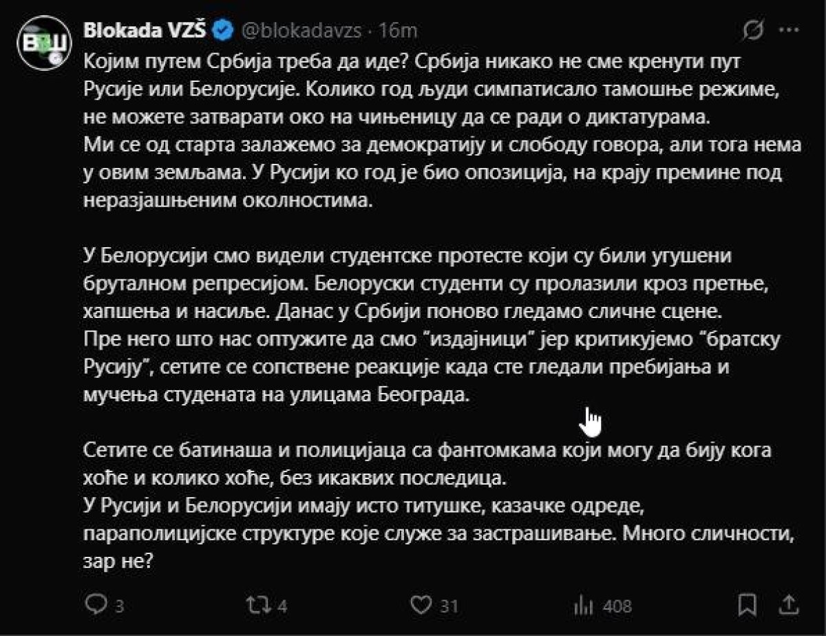 Naime, blokaderi Više zdravstvene škole (VZŠ) oglasili su se na društvenim mrežama i u objavi jasno poručili da je predsednik Rusije diktator, kao i predsednik Belorusije, i da Srbija mora da ide protiv Rusije i Belorusije!