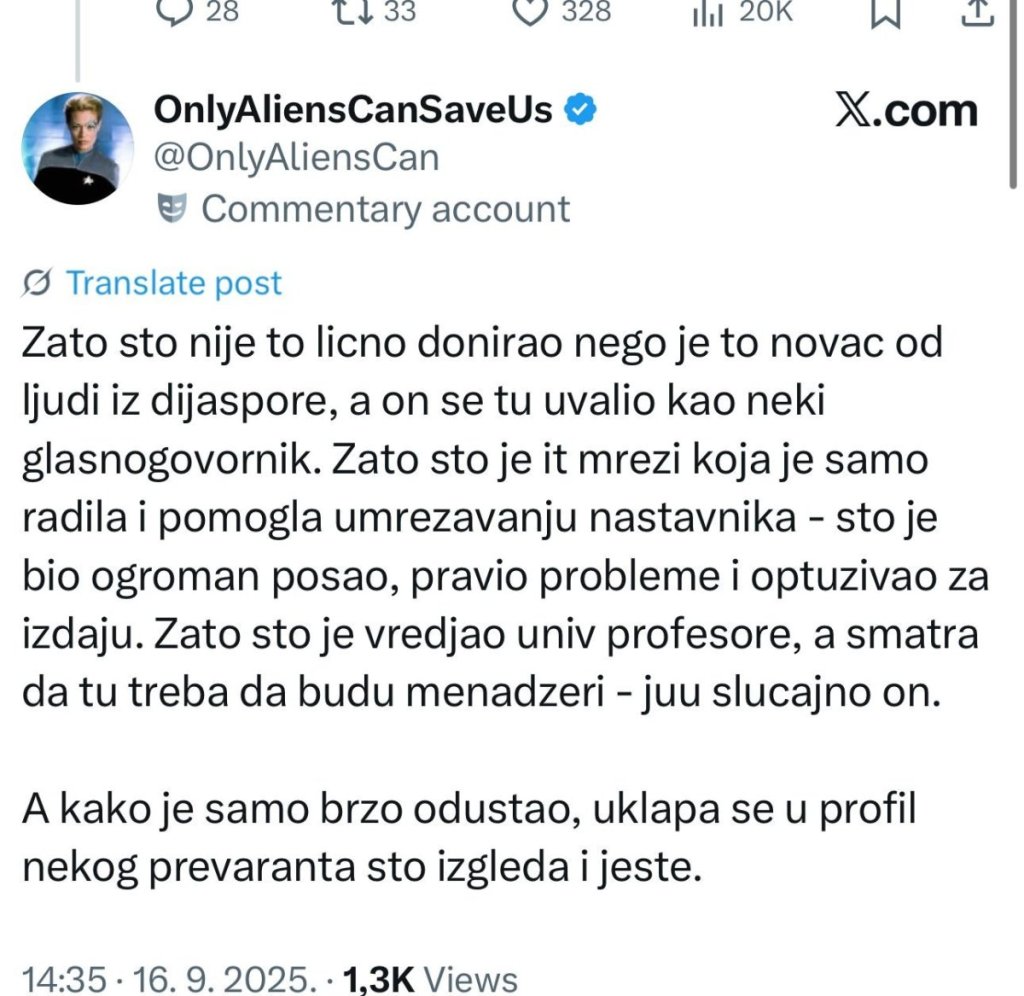 - Zato što nije to lično donirao, nego je to novac od ljudi iz dijaspore, a on se tu uvalio kao neki glasnogovornik. Zato što je IT mreži koja je samo radila i pomogla umrežavanju nastavnika - što je bio ogroman posao, pravio probleme i optuživao za izdaju. Zato što je vređao univerzitetske profesore, a smatra da tu treba da budu menadžeri - ju slučajno on. A kako je samo brzo odustao, uklapa se u profil nekog prevaranta, što izgleda i jeste - naveo je jedan blokader.
