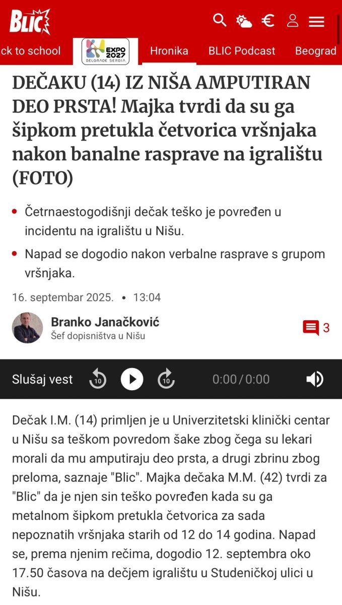 Posle najmorbidnije laži da je 'preminuo dečak iz Valjeva zbog policijske brutalnosti', sada su blokaderi otišli još jedan stepenik morbidnije i izmislili da je jednom dečaku (14) iz Niša amputiran prst, jer ga je 'policija pretukla'!?!