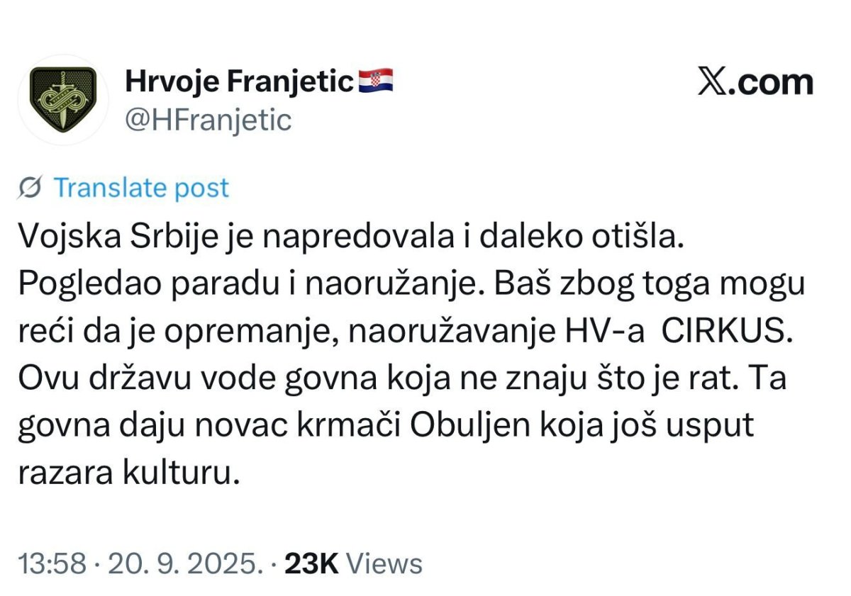- Vojska Srbije je napredovala i daleko otišla. Pogledao paradu i naoružanje. Baš zbog toga mogu reći da je opremanje, naoružavanje HV cirkus. Ovu državu vode govna koja ne znaju šta je rat - napisao je između ostalog on.