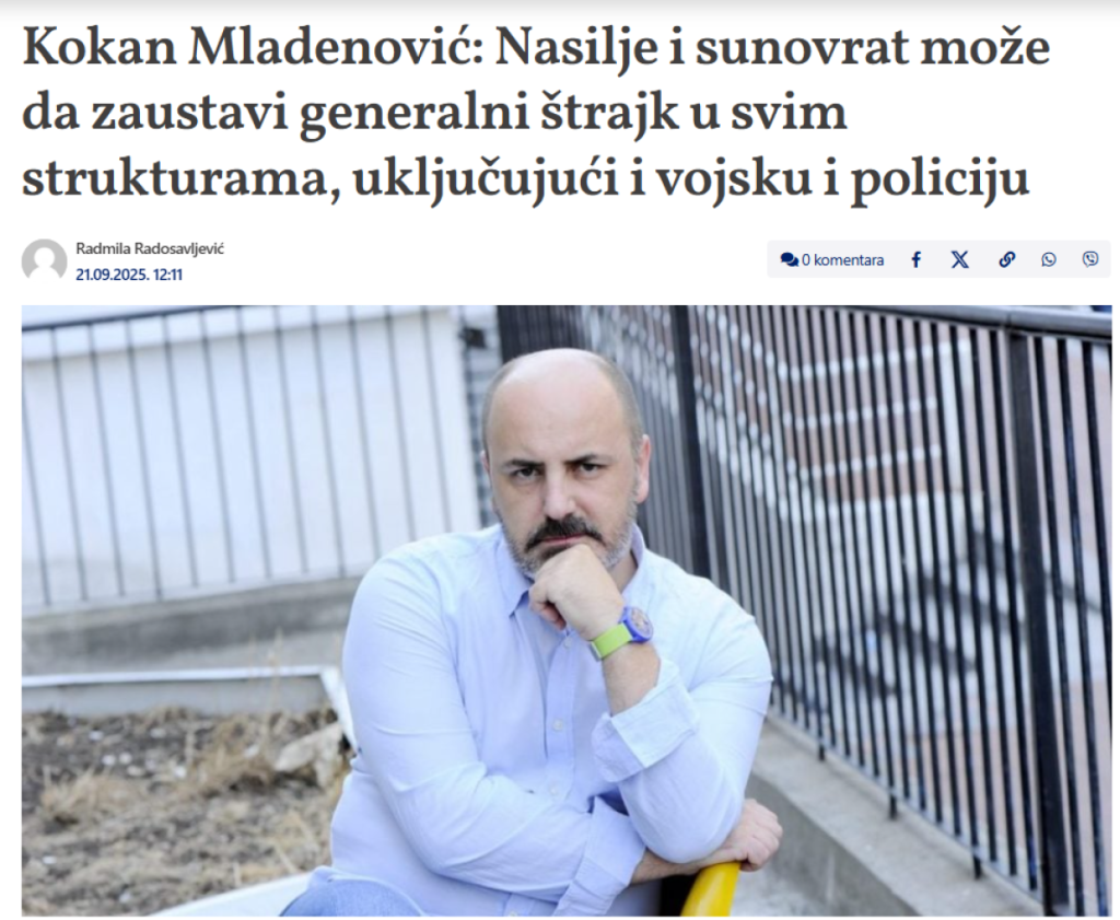 Šarović o generalnom štrajku govorio na hejterskoj KTV televiziji kod revolucinara u pokušaju Aleksandra Dikića, dok je Mladenović je svoju tezu o generalnom štrajku plasirao u niskotiražnom tabloidu Danas.