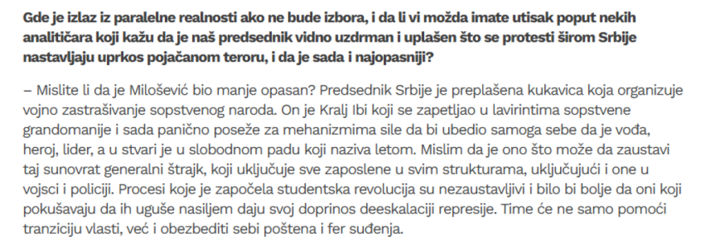 - Mislim da je ono što može da zaustavi taj sunovrat generalni štrajk, koji uključuje sve zaposlene u svim strukturama, uključujući i one u vojsci i policiji. Procesi koje je započela studentska revolucija su nezaustavljivi i bilo bi bolje da oni koji pokušavaju da ih uguše nasiljem daju svoj doprinos deeskalaciji represije. Time će ne samo pomoći tranziciju vlasti, već i obezbediti sebi poštena i fer suđenja - rekao je Mladenović.