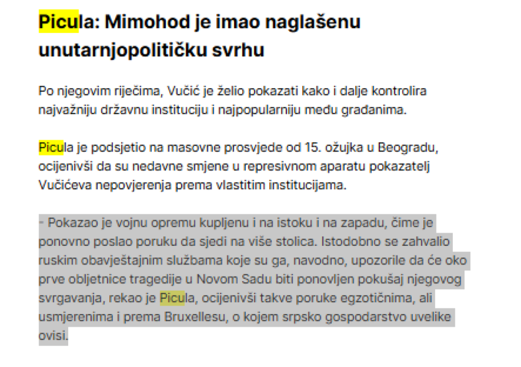 U intervjuu hrvatskom radiju, Picula je rekao da je Vučić želeo da pokaže da i dalje kontroliše najvažniju državnu instituciju i najpopularniju među građanima - a posebno je zanimljivo to što mu smetaju dobri odnosi koje je Srbija, na čelu sa Aleksandrom Vučićem, izgradila sa Zapadom i Istokom.
