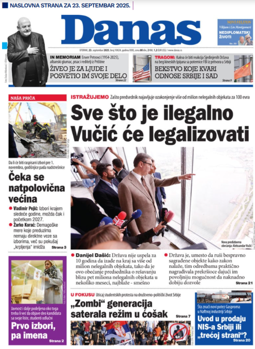 I tajkunski Danas kao glavnu najavu na naslovnoj strani donosi tekst pod naslovom "Sve što je ilegalno Vučić će legalizovati", što je još jedan dokaz da tajkunski mediji ne prezaju ni od čega, samo kada treba da naude šefu države.