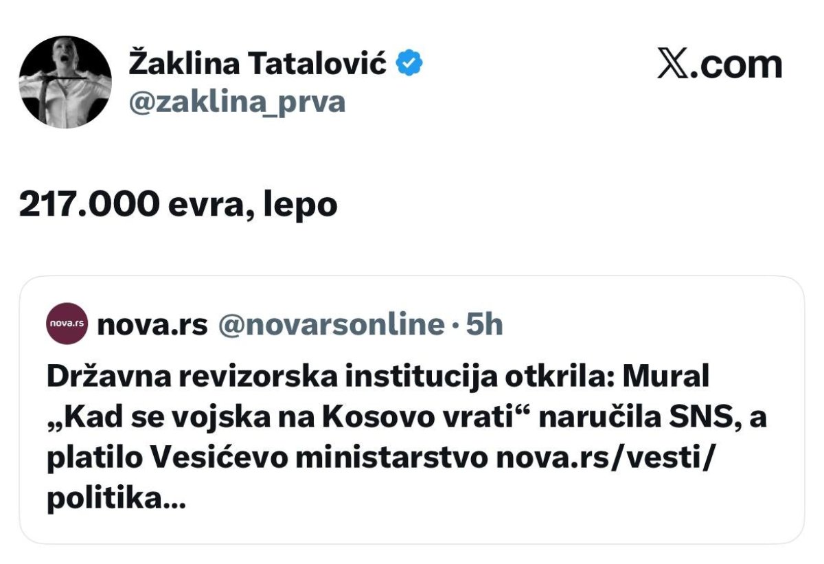 Nakon što je portal Nova danas objavio netačnu vest o tome da je Srpska napredna stranka naručila oslikavanje murala "Kad se vojska na Kosovo vrati" u blizini Brankovog mosta, a realizaciju toga isfinansiralo ministarstvo na čijem je čelu tada bio Goran Vesić, Tatalovićeva je to brže-bolje podelila na "Iksu".