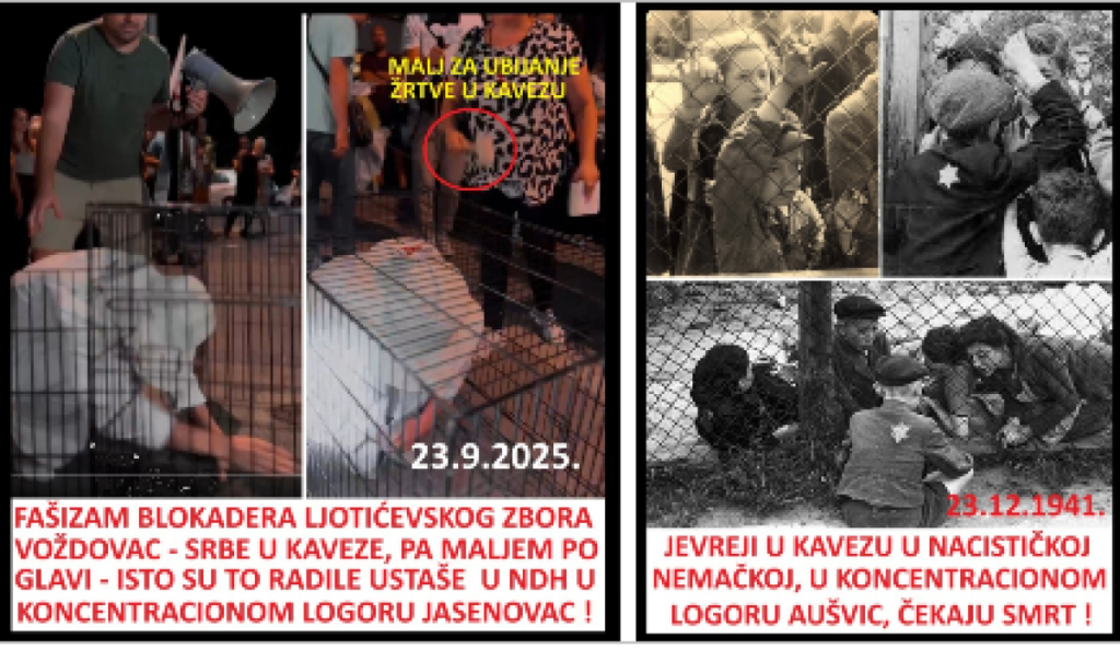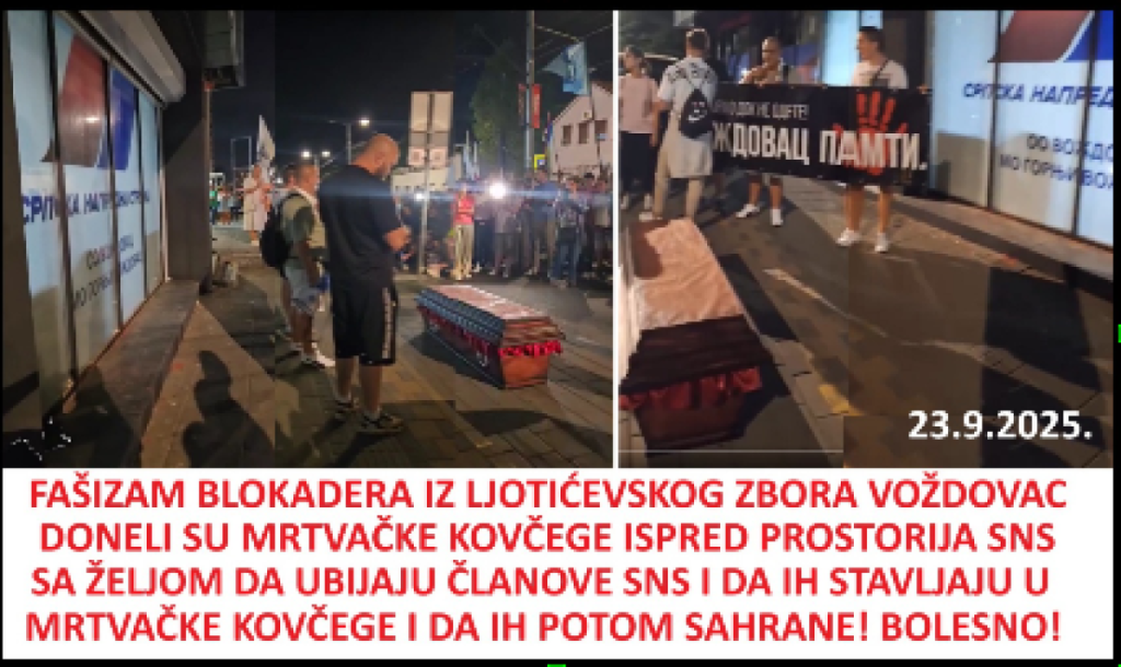Juče uveče, 23.9.2025. godine, blokaderi fašisti iz ljotićevskog Zbora Voždovac, su promovisali svoju nacističku politiku. Doneli su mrtvačke kovčege ispred prostorija SNS na Voždovcu, čime su najavili ubijanje članova SNS. Jer čemu služe mrtvački kovčezi? Služe sahranjivanju ljudi. Radi se o pretnjama smrću, pa mora da reaguje tužilaštvo. Ovaj fašistički pir je napravljen po ugledu na istovetne poteze nemačkih nacista i hrvatskih ustaša. I jedni i drugi su donosili mrtvačke kovčege ispred kuća Jevreja i Srba. Poruka je bila jasna- ubićemo vas i sahraniti. Nacisti i ustaše su pretnje sproveli u delo. Nemci su počinili su genocid nad Jevrejima, Rusima, Srbima, Poljacima i Romima, a Hrvati su počinili genocid nad Srbima, Romima i Jevrejima u Jasenovcu.