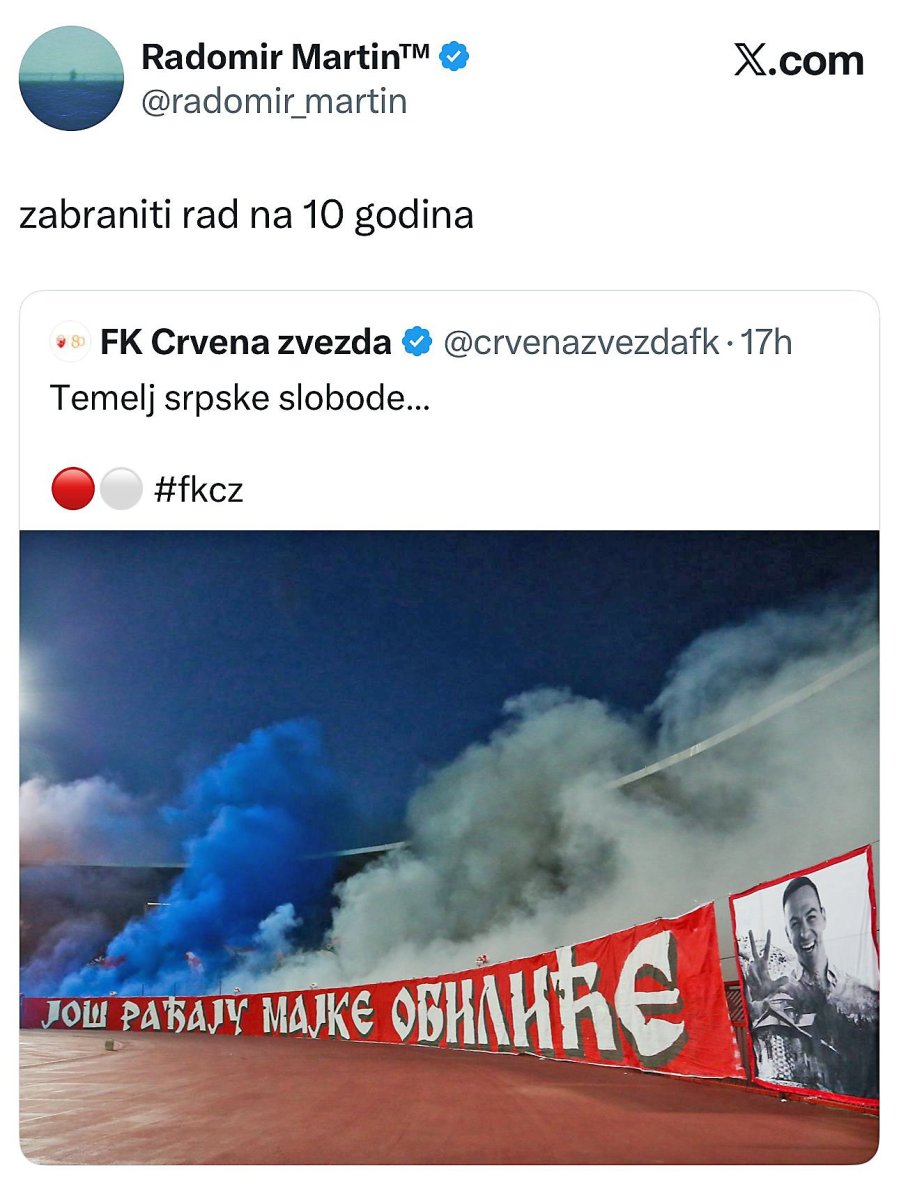 Novinar Birna Radmilo Marković traži da Crvena zvezda bude zabranjena jer su navijači tog kluba odali počast srpskim herojima koje su ubili Kurtijevi teroristi.