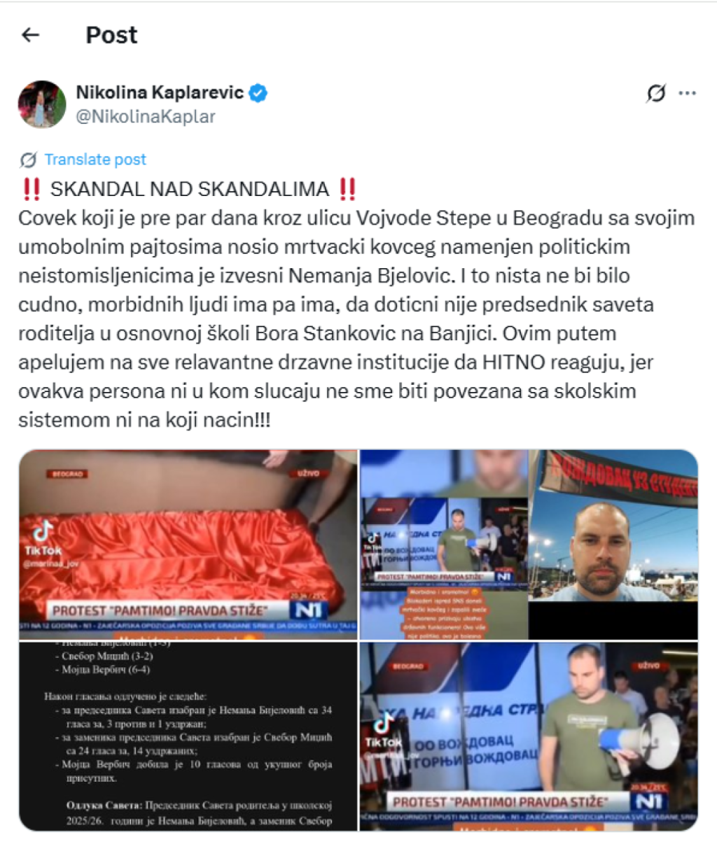 - I to ništa ne bi bilo čudno, morbidnih ljudi ima, pa ima, ali dotični je predsednik saveta roditelja u osnovnoj školi Bora Stanković na Banjici - otkrila je na društvenoj mreži Iks žena koja se predstavlja kao Nikolina Kaplarevic.