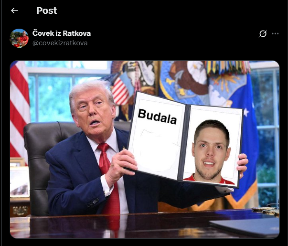 Objava na Tviteru prikazuje Donalda Trampa, predsednika SAD, kako drži fasciklu sa likom Štimca uz kratak opis "Budala".