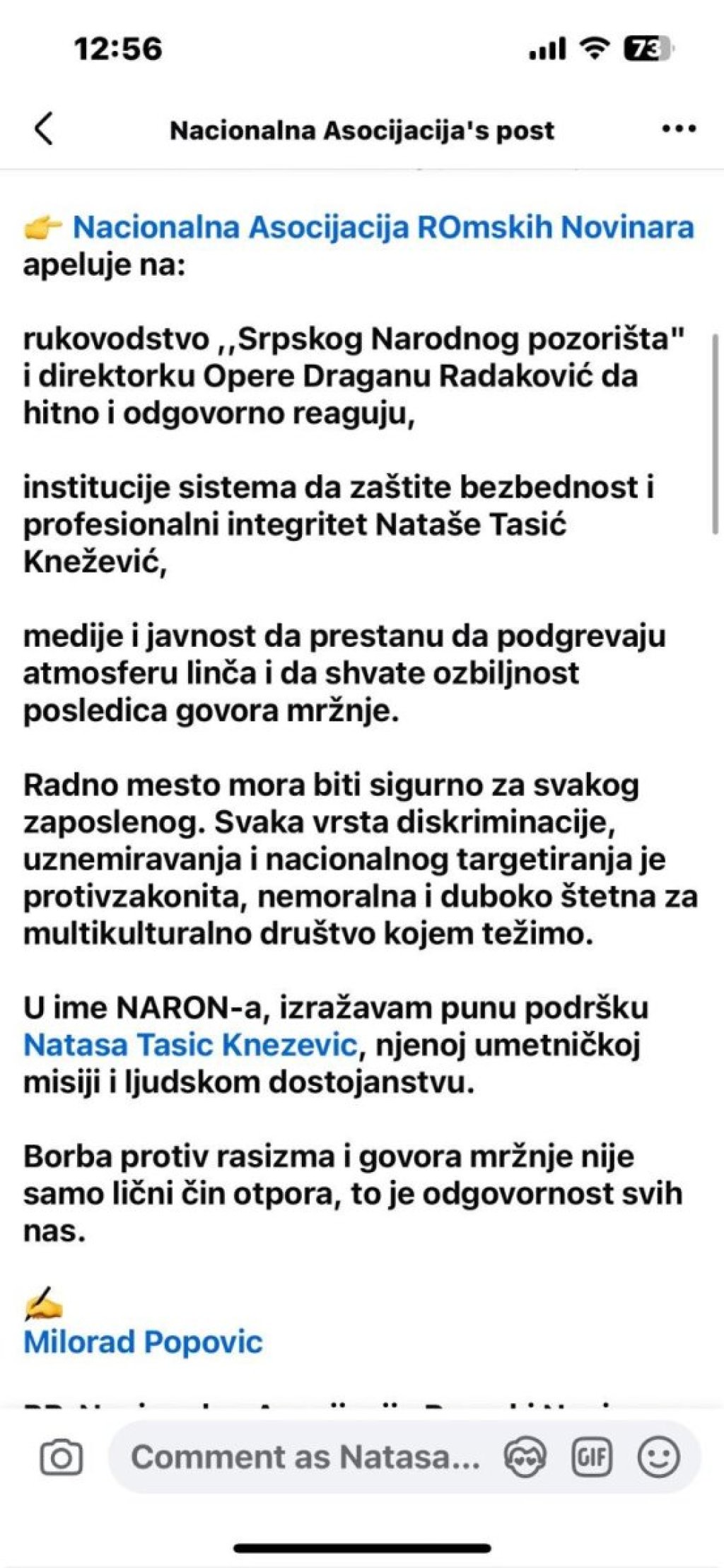 - Nacionalna Asocijacija Romskih Novinara apeluje na rukovodstvo "Srpskog Narodnog pozorišta" i direktorku Opere Draganu Radaković da hitno i odgovorno reaguju, institucije sistema da zaštite bezbednost i profesionalni integritet Nataše Tasic Knežević, medije i javnost da prestanu da podgrevaju atmosferu linća i da shvate ozbiljnost posledica govora mržnje - kaže se u saopštenju i podvlači da radno mesto mora biti sigurno za svakog zaposlenog.