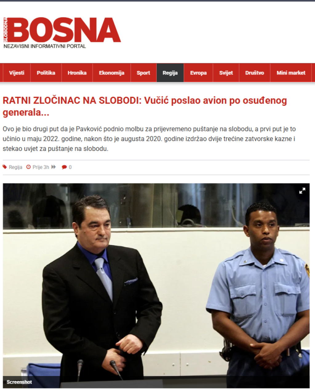 U tekstu pod naslovom "Ratni zločinac na slobodi: Vućić poslao avion po osuđenog generala", ekstremističko glasilo zvaničnog Sarajeva podseća da je Pavković odslužio dve trećine kazne i stekao uslov za puštanje na slobodu tek iz drugog puta, pošto je njegov zahtev odbijen 2020. godine.