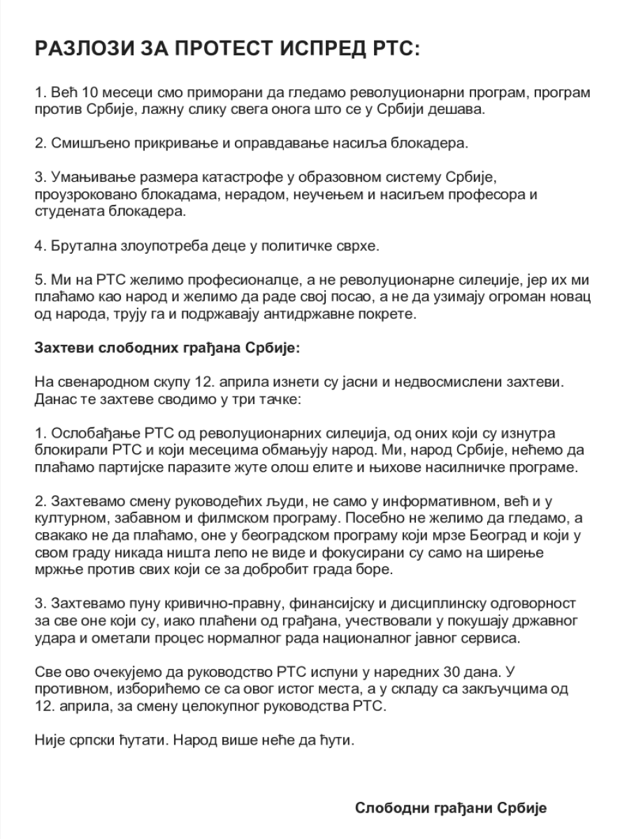 Sve ovo očekujemo da rukovodstvo RTS ispuni u narednih 30 dana, u protivnom, izborićemo se, sa ovog istog mesta, a u skladu sa zaključcima od 12. aprila, za smenu celokupnog rukovodstva RTS. Nije srpski ćutati, i narod više neće da ćuti - poručili su.