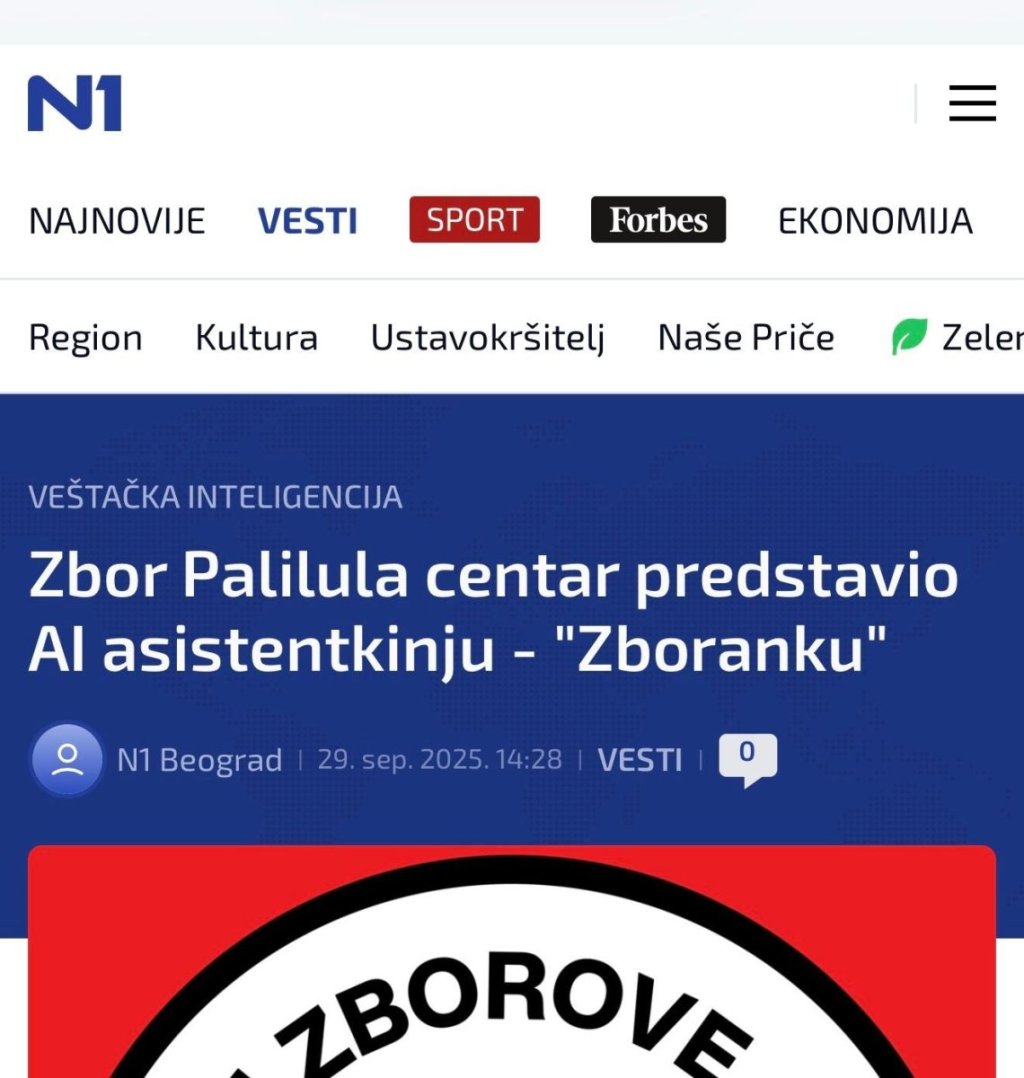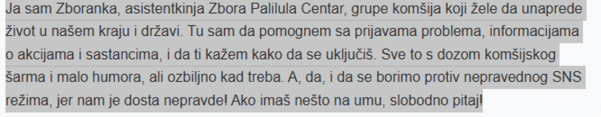 "Ja sam Zboranka, asistentkinja Zbora Palilula Centar, grupe komšija koji žele da unaprede život u našem kraju i državi....A, da, i da se borimo protiv nepravednog SNS režima, jer nam je dosta nepravde! Ako imaš nešto na umu, slobodno pitaj!"