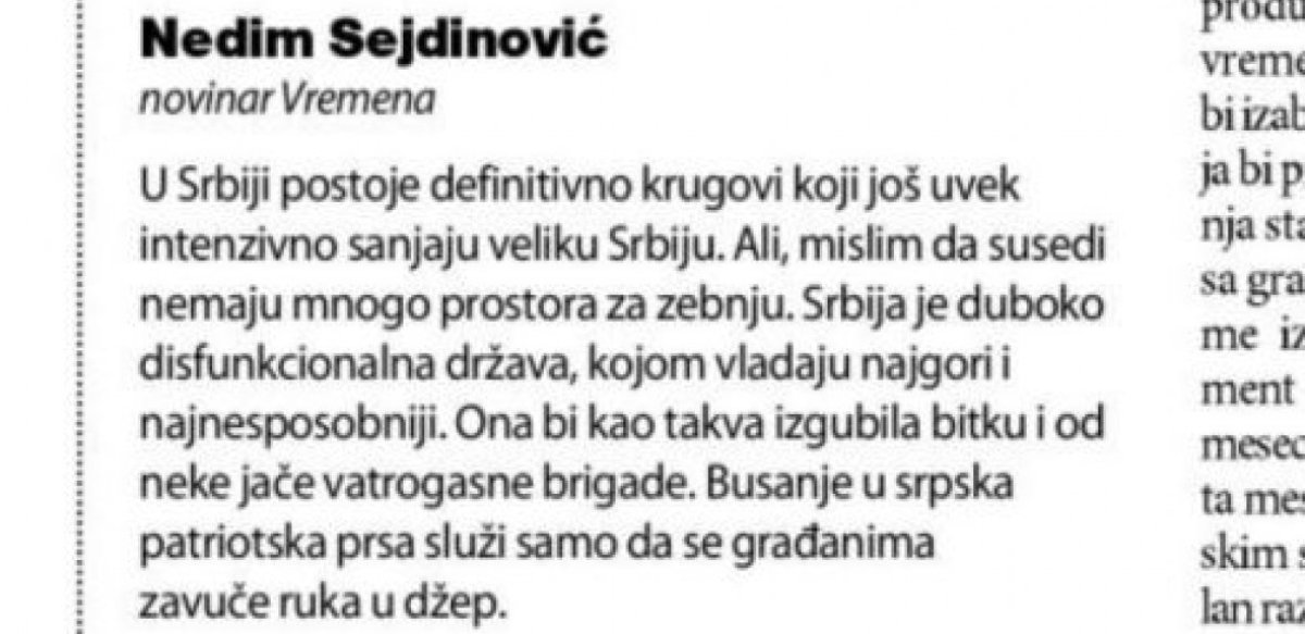 U isto vreme, prenose i izjavu desne ruke Dinka Gruhonjića, Nedima Sejdinovića da je "Srbija regionalna opasnost, jer Srbi i dalje sanjaju Veliku Srbiju!"