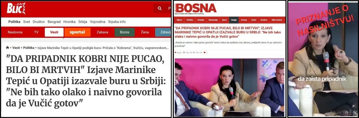 Marinika Tepić je rekla sledeće: „Ovo ću reći zaista iskreno. Da zaista pripadnik "Kobri", odnosno Specijalne jedinice vojne policije u Novom Sadu, pre dva meseca nije pucao iz pištolja, upozoravajući, bilo bi mrtvih. Atmosfera je na ivici noža, a situacija je problematična zato što je niko ne kontroliše. Ne postoji koordinacija između studenata, opozicije, nevladinog i pro-EU sektora. I u takvoj atmosferi anarhije je gotovo pitanje dana kada će doći do nekih žrtava. Što se tiče 1. novembra, ja ne znam šta da vam kažem. Rizik je stopostotni, a opet može da bude potpuno mirno. A može da bude mirno u komemorativnom delu, dok prođe to odavanje pošte za 16 žrtava. A onda, kako to ume da se desi, onda se kaže „evo, proteste prepuštamo građanima“, i onda ume da eskalira, zato što nema koordinacije“.
