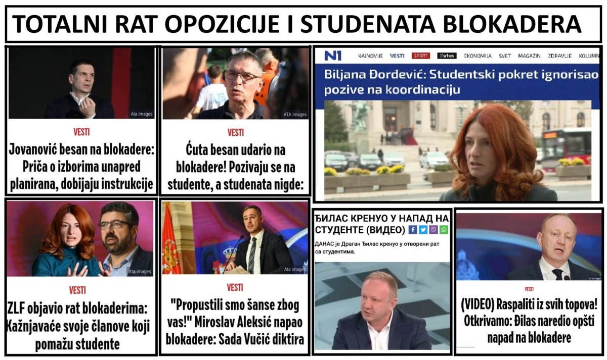 Da ukratko objasnim zbog čega se sukobljavaju blokaderi i opozicija. Opoziciona bara je mala, izvor glasova za opoziciju i blokadere je ograničen. Studenti blokaderi (antisrbi) pokušavaju da zamene kompromitovanu opoziciju i zbog toga odbijaju saradnju sa njima. Na stranu to, što su se studenti blokaderi za ovih 11 meseci potpuno kompromitovali. Antisrpske opozicione stranke žestoko napadaju antisrpske studente blokadere zbog toga što studenti blokaderi pozivaju opoziciju da ne učestvuje na izborima, već da podrži njihovu listu (na kojoj nema opozicije). To znači nema mandata i finansiranja za opoziciju. Stoga je opozicija počela da žestoko napada studente blokadere.