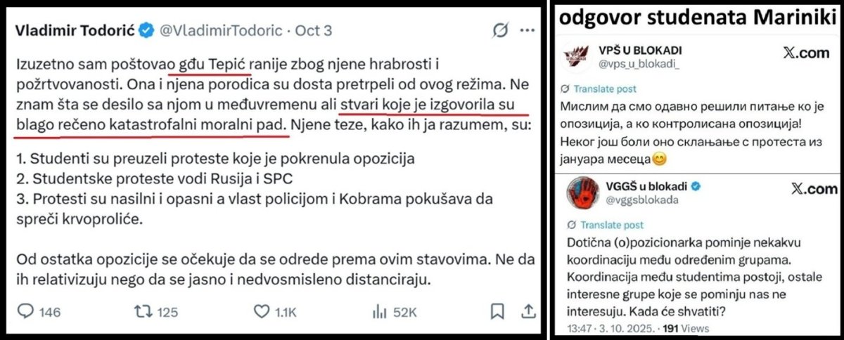 Dubinu svakodnevnih sukoba blokadera i opozicije, najbolje opisuje reakcija bivšeg Đilasovog advokata i funkcionera, Vladimira Todorića, koji se 3.10.2025., obrušio na Mariniku Tepić na platformi „X“, zbog njenog, kako je napisao „katastrofalnog moralnog pada“. Todorić kaže: „ Izuzetno sam poštovao gđu Tepić ranije zbog njene hrabrosti i požrtvovanosti. Ne znam šta se desilo sa njom u međuvremenu ali stvari koje je izgovorila su blago rečeno katastrofalni moralni pad. Njene teze, kako ih ja razumem, su: 1. Studenti su preuzeli proteste koje je pokrenula opozicija 2. Studentske proteste vodi Rusija i SPC 3. Protesti su nasilni i opasni a vlast policijom i Kobrama pokušava da spreči krvoproliće. Od ostatka opozicije se očekuje da se odrede prema ovim stavovima. Ne da ih relativizuju nego da se jasno i nedvosmisleno distanciraju“. Todorić potvrđuje moje jasno tumačenje reči Marinike Tepić. Reči Marinike Tepić iz Opatije, koje sam citirao na početku teksta, i Todorićevu reakciju su prećutali svi opozicioni mediji, da bi prikrili šta je ona rekla o ubilačkim namerama studenata blokadera, i da bi prikrili sukobe u opoziciji. Nadam se da je neki tužilac koji se bavi napadom na prostorije SNS, 13.8.2025., čuo svedočenje Marinike Tepić, i da će je pozvati da podeli svoja saznanja, o kojima je govorila u Opatiji, sa tužilaštvom. Marinika bi bila sjajan svedok saradnik.