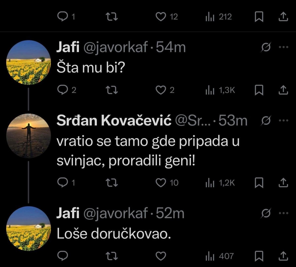 - Neka nadležni organi ispitaju svaki detalj i ispostaviće se da je sve bila notorna laž, koju im je podvalila osoba koja je optužena za terorizam i nalazi se u pritvoru. Taj nasilnik im je u jednom kafeu u Kraljevu plasirao priču, za koju se ispostavilo da je notorna laž. Žao mi je tog čoveka ogrezlog u mržnju, koji se raduje nečijoj nesreći. Jedina tačna njegova izjava je da je 2023. izgubio lokalne izbore u Kraljevu i da sam ja kriv za to, jer sam direktno organizovao kampanju kako na vlast ne bi došli takvi kao on. Pošto kažu da me stalno pominje, da se budi i leže sa mojim imenom, mogu da mu pošaljem svoju fotografiju ako mu baš toliko nedostajem ili da mu pošaljem fotografiju svog ožiljka na preponama da ga uverim da sam zaista imao intervenciju.