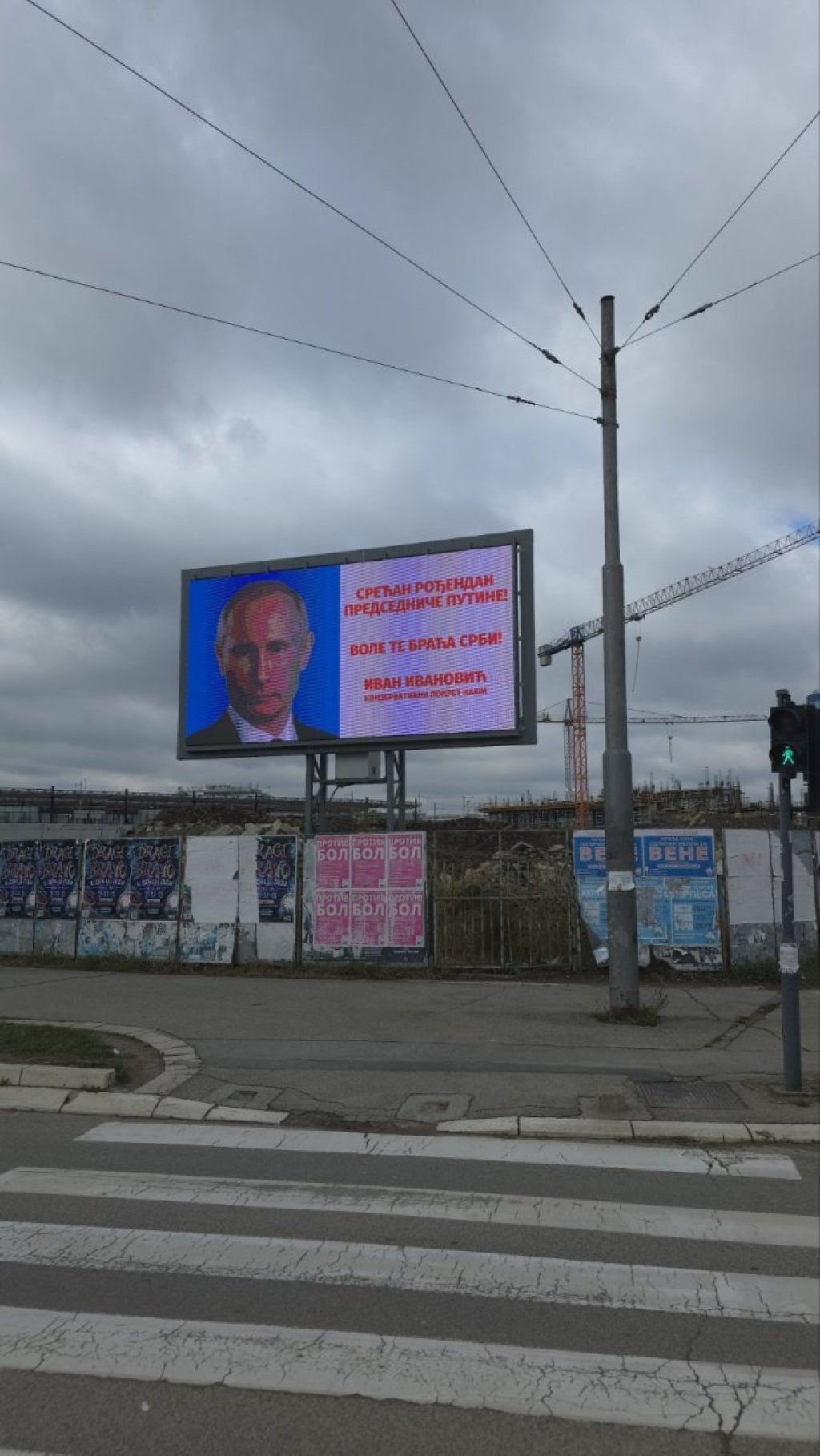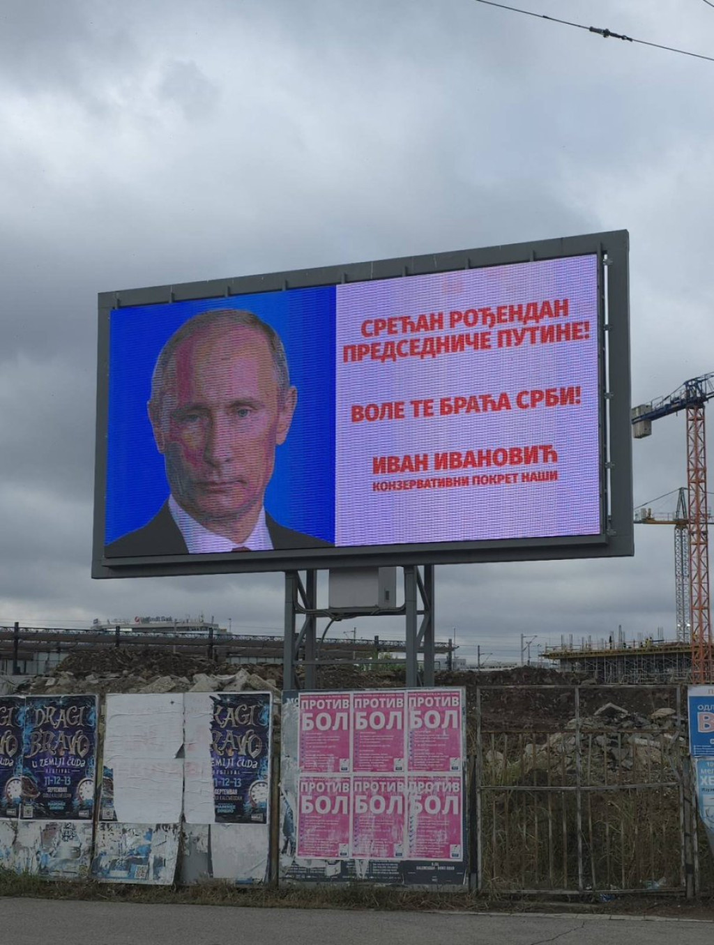Konzervativni pokret NAŠI danas na bilbordima u Beogradu i Novom Sadu objavljuje rođendansku čestitku predsedniku Ruske Federacije Vladimiru Vladimiroviču Putinu, sa porukom: