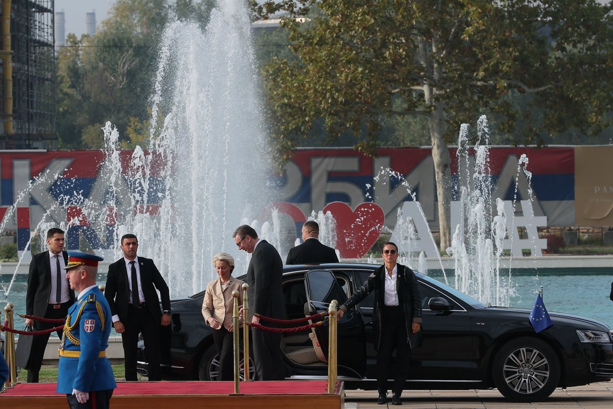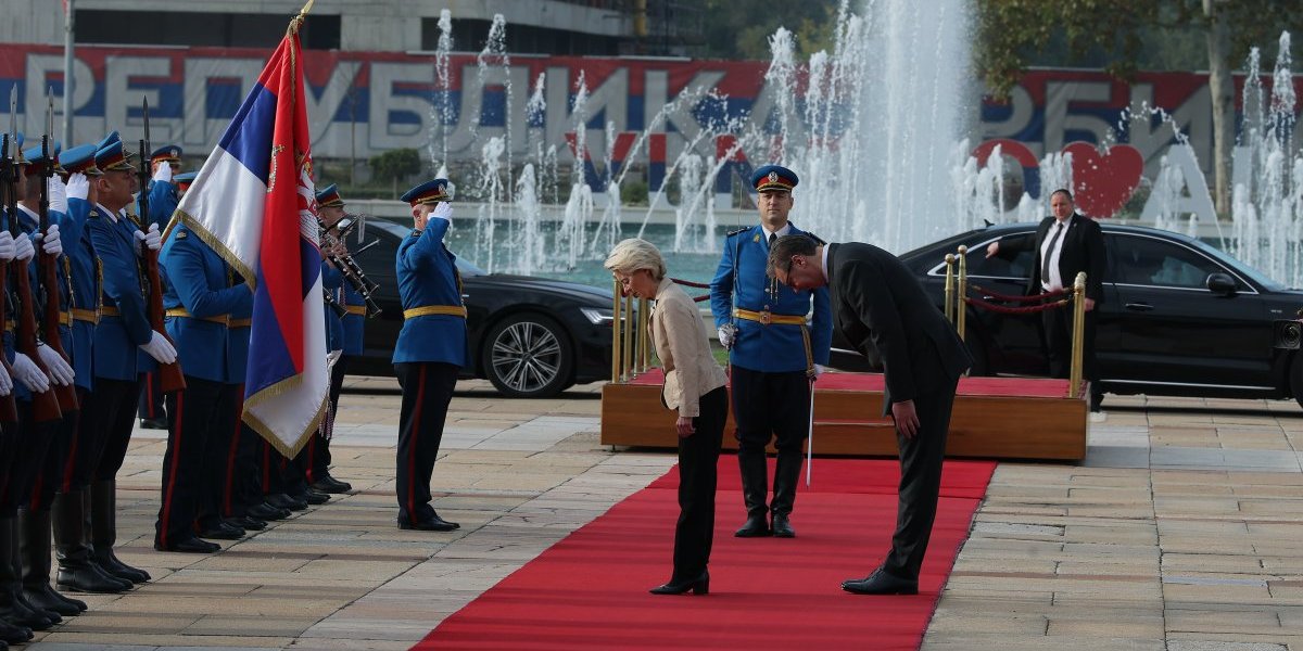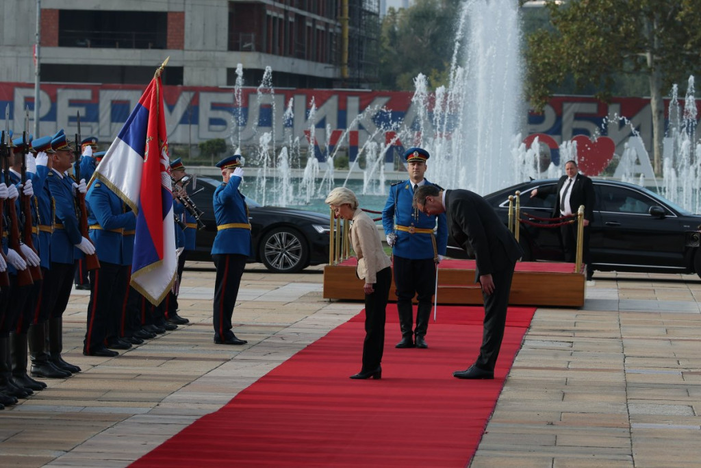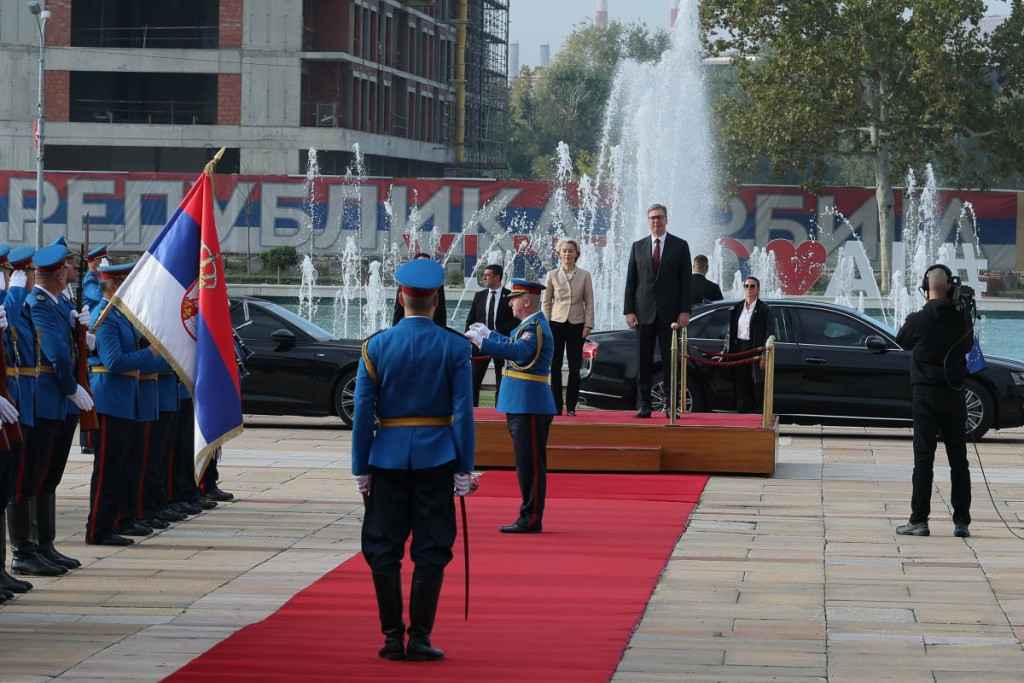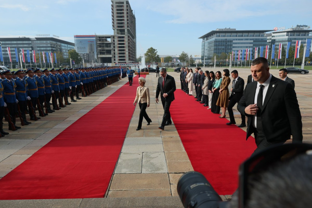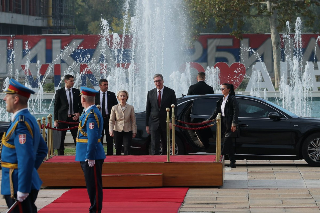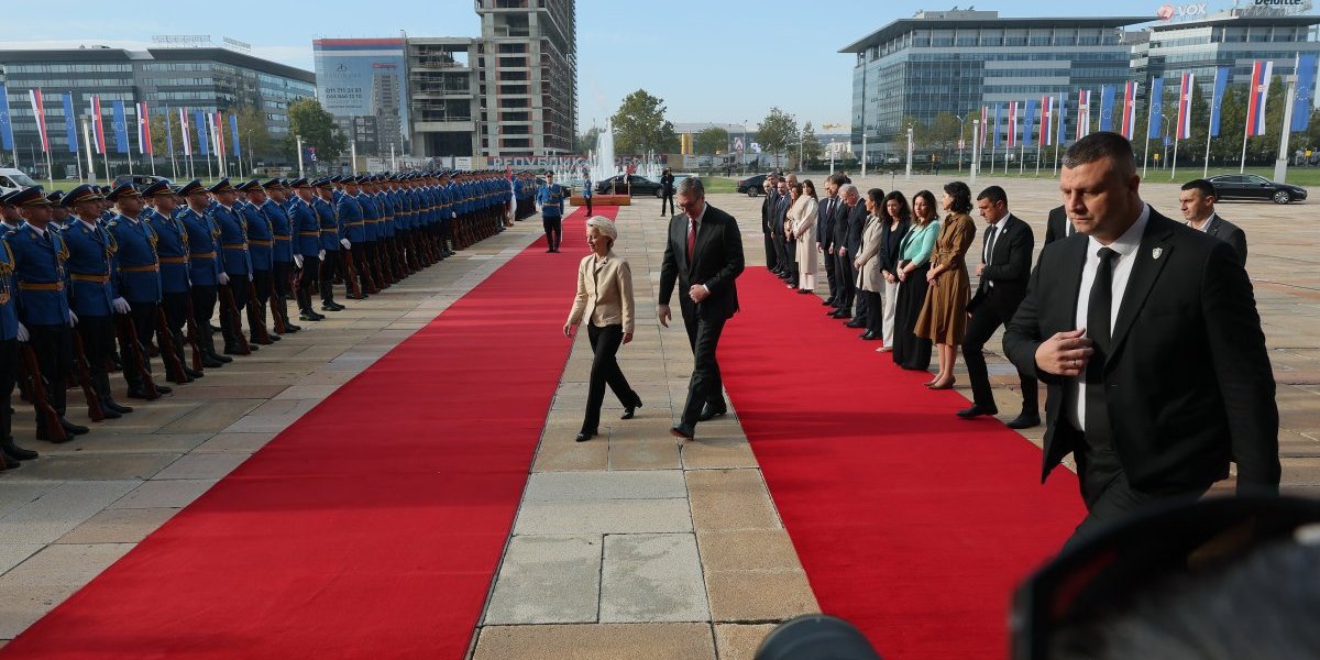 Predsednik je Ursulu fon der Lajen dočekao svečano ispred Palate "Srbija" uz himu, gardu i crveni tepih. Nakon toga je usledio tet-a-tet sastanak Vučića i Fon der Lajen.